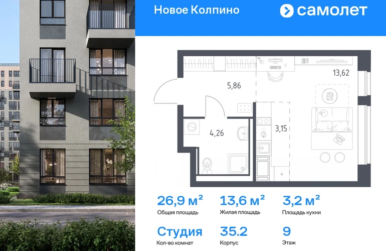 Предлагается квартира студия комфорт-класса 26,89 кв.м в корпусе 35.2 на 9 этаже, в ЖК «Новое Колпино» Квартира без отделки. Доступность опции «отделка» и возможность комплектации мебелью и декором уточняйте у застройщика. Приобрести квартиру возможно по специальным акциям от застройщика, с текущими условиями акций можно ознакомиться в блоке «Акций». Цена динамическая и может отличаться, уточняйте актуальность у застройщика. Квартал «Новое Колпино» — современный квартал в тихом и зеленом районе Санкт-Петербурга. Здесь можно подолгу любоваться пышными кронами деревьев, подставляя лицо теплым лучам солнца. А еще в любой момент можно сесть в машину и уже через час оказаться в сердце Северной столицы. Будет легко планировать поездки: до центра Петербурга, или площади Восстания, — 25 минут на поезде. С территории квартала удобно выезжать на крупные магистрали: путь до Южного шоссе займет 15 минут на авто, а до Петрозаводского шоссе — всего 6 минут. В 20 минутах на авто находится метро «Рыбацкое», а в 7 минутах — ж/д станция Колпино. Проводите выходные на природе в Колпинском парке, который находится недалеко от квартала, на берегу реки Ижоры. Летом здесь можно вместе с детьми веселиться на аттракционах, кататься на лодке, играть в бадминтон или волейбол. А еще можно захватить орехов и покормить белок. Всего 7 минут на авто или автобусе — и вы в центре города Колпино. Взрослых впечатлит русская архитектура старинных церквей, а детям понравится забавный памятник героям мультфильма «Трое из Простоквашино». В «Новом Колпино» будут работать 4 детских сада, 3 из них уже готовы встречать малышей. Ребята постарше могут ходить на занятия в школу с собственным бассейном, в проекте уже работает новая современная школа с бассейном Корпуса высотой 11 этажей с французскими и панорамными балконами отделаны штукатуркой и облицовочным кирпичом. Вдохновение для палитры нам подарили оттенки рассветного неба: терракотовый, персиковый, песочный. Во дворе найдется интересное занятие для всех жителей квартала. Взрослые смогут устраивать тренировки на свежем воздухе в спортивных зонах, дети будут целый день веселиться на игровых площадках. А еще мы позаботились о вашей безопасности и закрыли дворы от машин. Возвращайтесь домой с чемоданом из путешествия или коляской из парка. На пути в подъезд вы не встретите ступенек. Оставить транспорт можно будет в специальном помещении на первом этаже. По желанию вы сможете получить ключи от квартиры с готовой отделкой. Мы положим ламинат, поклеим обои, установим мебель и сантехнику. Доступен вариант с готовой кухней — бежевые тона отделки станут фоном для интерьера мечты. Чтобы сразу отпраздновать новоселье, закажите у нас декор и мебельные сеты. А если хочется воплотить собственные идеи в интерьере, присмотритесь к опции — без отделки.#yan19-2r1804456#О застройщике