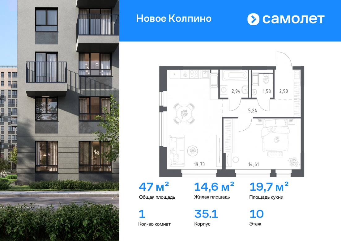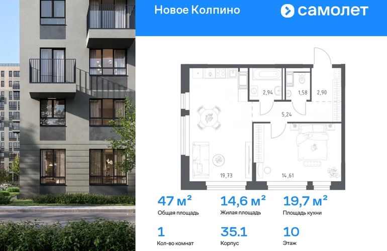 Предлагается 1-комнатная квартира комфорт-класса 47 кв.м в корпусе 35.1 на 10 этаже, в ЖК «Новое Колпино» Квартира с чистовой отделкой. Доступность дополнительных опций уточняйте у застройщика. Приобрести квартиру возможно по специальным акциям от застройщика, с текущими условиями акций можно ознакомиться в блоке «Акций». Цена динамическая и может отличаться, уточняйте актуальность у застройщика. Квартал «Новое Колпино» — современный квартал в тихом и зеленом районе Санкт-Петербурга. Здесь можно подолгу любоваться пышными кронами деревьев, подставляя лицо теплым лучам солнца. А еще в любой момент можно сесть в машину и уже через час оказаться в сердце Северной столицы. Будет легко планировать поездки: до центра Петербурга, или площади Восстания, — 25 минут на поезде. С территории квартала удобно выезжать на крупные магистрали: путь до Южного шоссе займет 15 минут на авто, а до Петрозаводского шоссе — всего 6 минут. В 20 минутах на авто находится метро «Рыбацкое», а в 7 минутах — ж/д станция Колпино. Проводите выходные на природе в Колпинском парке, который находится недалеко от квартала, на берегу реки Ижоры. Летом здесь можно вместе с детьми веселиться на аттракционах, кататься на лодке, играть в бадминтон или волейбол. А еще можно захватить орехов и покормить белок. Всего 7 минут на авто или автобусе — и вы в центре города Колпино. Взрослых впечатлит русская архитектура старинных церквей, а детям понравится забавный памятник героям мультфильма «Трое из Простоквашино». В «Новом Колпино» будут работать 4 детских сада, 3 из них уже готовы встречать малышей. Ребята постарше могут ходить на занятия в школу с собственным бассейном, в проекте уже работает новая современная школа с бассейном Корпуса высотой 11 этажей с французскими и панорамными балконами отделаны штукатуркой и облицовочным кирпичом. Вдохновение для палитры нам подарили оттенки рассветного неба: терракотовый, персиковый, песочный. Во дворе найдется интересное занятие для всех жителей квартала. Взрослые смогут устраивать тренировки на свежем воздухе в спортивных зонах, дети будут целый день веселиться на игровых площадках. А еще мы позаботились о вашей безопасности и закрыли дворы от машин. Возвращайтесь домой с чемоданом из путешествия или коляской из парка. На пути в подъезд вы не встретите ступенек. Оставить транспорт можно будет в специальном помещении на первом этаже. По желанию вы сможете получить ключи от квартиры с готовой отделкой. Мы положим ламинат, поклеим обои, установим мебель и сантехнику. Доступен вариант с готовой кухней — бежевые тона отделки станут фоном для интерьера мечты. Чтобы сразу отпраздновать новоселье, закажите у нас декор и мебельные сеты. А если хочется воплотить собственные идеи в интерьере, присмотритесь к опции — без отделки.#yan19-2r1805760#О застройщике