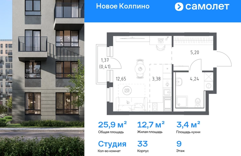 Предлагается квартира студия комфорт-класса 25,88 кв.м в корпусе 33 на 9 этаже, в ЖК «Новое Колпино» Квартира с предчистовой отделкой. Доступность дополнительных опций уточняйте у застройщика. Приобрести квартиру возможно по специальным акциям от застройщика, с текущими условиями акций можно ознакомиться в блоке «Акций». Цена динамическая и может отличаться, уточняйте актуальность у застройщика. Квартал «Новое Колпино» — современный квартал в тихом и зеленом районе Санкт-Петербурга. Здесь можно подолгу любоваться пышными кронами деревьев, подставляя лицо теплым лучам солнца. А еще в любой момент можно сесть в машину и уже через час оказаться в сердце Северной столицы. Будет легко планировать поездки: до центра Петербурга, или площади Восстания, — 25 минут на поезде. С территории квартала удобно выезжать на крупные магистрали: путь до Южного шоссе займет 15 минут на авто, а до Петрозаводского шоссе — всего 6 минут. В 20 минутах на авто находится метро «Рыбацкое», а в 7 минутах — ж/д станция Колпино. Проводите выходные на природе в Колпинском парке, который находится недалеко от квартала, на берегу реки Ижоры. Летом здесь можно вместе с детьми веселиться на аттракционах, кататься на лодке, играть в бадминтон или волейбол. А еще можно захватить орехов и покормить белок. Всего 7 минут на авто или автобусе — и вы в центре города Колпино. Взрослых впечатлит русская архитектура старинных церквей, а детям понравится забавный памятник героям мультфильма «Трое из Простоквашино». В «Новом Колпино» будут работать 4 детских сада, 3 из них уже готовы встречать малышей. Ребята постарше могут ходить на занятия в школу с собственным бассейном, в проекте уже работает новая современная школа с бассейном Корпуса высотой 11 этажей с французскими и панорамными балконами отделаны штукатуркой и облицовочным кирпичом. Вдохновение для палитры нам подарили оттенки рассветного неба: терракотовый, персиковый, песочный. Во дворе найдется интересное занятие для всех жителей квартала. Взрослые смогут устраивать тренировки на свежем воздухе в спортивных зонах, дети будут целый день веселиться на игровых площадках. А еще мы позаботились о вашей безопасности и закрыли дворы от машин. Возвращайтесь домой с чемоданом из путешествия или коляской из парка. На пути в подъезд вы не встретите ступенек. Оставить транспорт можно будет в специальном помещении на первом этаже. По желанию вы сможете получить ключи от квартиры с готовой отделкой. Мы положим ламинат, поклеим обои, установим мебель и сантехнику. Доступен вариант с готовой кухней — бежевые тона отделки станут фоном для интерьера мечты. Чтобы сразу отпраздновать новоселье, закажите у нас декор и мебельные сеты. А если хочется воплотить собственные идеи в интерьере, присмотритесь к опции — без отделки.#yan19-2r1805999#О застройщике
