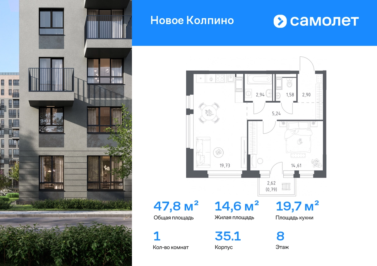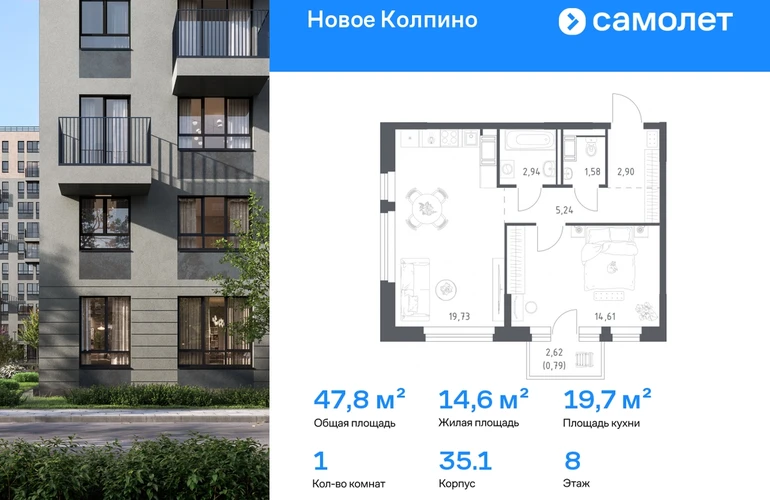 Предлагается 1-комнатная квартира комфорт-класса 47,79 кв.м в корпусе 35.1 на 8 этаже, в ЖК «Новое Колпино» Квартира с чистовой отделкой. Доступность дополнительных опций уточняйте у застройщика. Приобрести квартиру возможно по специальным акциям от застройщика, с текущими условиями акций можно ознакомиться в блоке «Акций». Цена динамическая и может отличаться, уточняйте актуальность у застройщика. Квартал «Новое Колпино» — современный квартал в тихом и зеленом районе Санкт-Петербурга. Здесь можно подолгу любоваться пышными кронами деревьев, подставляя лицо теплым лучам солнца. А еще в любой момент можно сесть в машину и уже через час оказаться в сердце Северной столицы. Будет легко планировать поездки: до центра Петербурга, или площади Восстания, — 25 минут на поезде. С территории квартала удобно выезжать на крупные магистрали: путь до Южного шоссе займет 15 минут на авто, а до Петрозаводского шоссе — всего 6 минут. В 20 минутах на авто находится метро «Рыбацкое», а в 7 минутах — ж/д станция Колпино. Проводите выходные на природе в Колпинском парке, который находится недалеко от квартала, на берегу реки Ижоры. Летом здесь можно вместе с детьми веселиться на аттракционах, кататься на лодке, играть в бадминтон или волейбол. А еще можно захватить орехов и покормить белок. Всего 7 минут на авто или автобусе — и вы в центре города Колпино. Взрослых впечатлит русская архитектура старинных церквей, а детям понравится забавный памятник героям мультфильма «Трое из Простоквашино». В «Новом Колпино» будут работать 4 детских сада, 3 из них уже готовы встречать малышей. Ребята постарше могут ходить на занятия в школу с собственным бассейном, в проекте уже работает новая современная школа с бассейном Корпуса высотой 11 этажей с французскими и панорамными балконами отделаны штукатуркой и облицовочным кирпичом. Вдохновение для палитры нам подарили оттенки рассветного неба: терракотовый, персиковый, песочный. Во дворе найдется интересное занятие для всех жителей квартала. Взрослые смогут устраивать тренировки на свежем воздухе в спортивных зонах, дети будут целый день веселиться на игровых площадках. А еще мы позаботились о вашей безопасности и закрыли дворы от машин. Возвращайтесь домой с чемоданом из путешествия или коляской из парка. На пути в подъезд вы не встретите ступенек. Оставить транспорт можно будет в специальном помещении на первом этаже. По желанию вы сможете получить ключи от квартиры с готовой отделкой. Мы положим ламинат, поклеим обои, установим мебель и сантехнику. Доступен вариант с готовой кухней — бежевые тона отделки станут фоном для интерьера мечты. Чтобы сразу отпраздновать новоселье, закажите у нас декор и мебельные сеты. А если хочется воплотить собственные идеи в интерьере, присмотритесь к опции — без отделки.#yan19-2r1807788#О застройщике