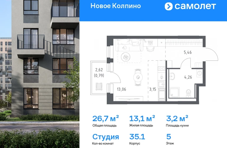 Предлагается квартира студия комфорт-класса 26,72 кв.м в корпусе 35.1 на 5 этаже, в ЖК «Новое Колпино» Квартира с чистовой отделкой. Доступность дополнительных опций уточняйте у застройщика. Приобрести квартиру возможно по специальным акциям от застройщика, с текущими условиями акций можно ознакомиться в блоке «Акций». Цена динамическая и может отличаться, уточняйте актуальность у застройщика. Квартал «Новое Колпино» — современный квартал в тихом и зеленом районе Санкт-Петербурга. Здесь можно подолгу любоваться пышными кронами деревьев, подставляя лицо теплым лучам солнца. А еще в любой момент можно сесть в машину и уже через час оказаться в сердце Северной столицы. Будет легко планировать поездки: до центра Петербурга, или площади Восстания, — 25 минут на поезде. С территории квартала удобно выезжать на крупные магистрали: путь до Южного шоссе займет 15 минут на авто, а до Петрозаводского шоссе — всего 6 минут. В 20 минутах на авто находится метро «Рыбацкое», а в 7 минутах — ж/д станция Колпино. Проводите выходные на природе в Колпинском парке, который находится недалеко от квартала, на берегу реки Ижоры. Летом здесь можно вместе с детьми веселиться на аттракционах, кататься на лодке, играть в бадминтон или волейбол. А еще можно захватить орехов и покормить белок. Всего 7 минут на авто или автобусе — и вы в центре города Колпино. Взрослых впечатлит русская архитектура старинных церквей, а детям понравится забавный памятник героям мультфильма «Трое из Простоквашино». В «Новом Колпино» будут работать 4 детских сада, 3 из них уже готовы встречать малышей. Ребята постарше могут ходить на занятия в школу с собственным бассейном, в проекте уже работает новая современная школа с бассейном Корпуса высотой 11 этажей с французскими и панорамными балконами отделаны штукатуркой и облицовочным кирпичом. Вдохновение для палитры нам подарили оттенки рассветного неба: терракотовый, персиковый, песочный. Во дворе найдется интересное занятие для всех жителей квартала. Взрослые смогут устраивать тренировки на свежем воздухе в спортивных зонах, дети будут целый день веселиться на игровых площадках. А еще мы позаботились о вашей безопасности и закрыли дворы от машин. Возвращайтесь домой с чемоданом из путешествия или коляской из парка. На пути в подъезд вы не встретите ступенек. Оставить транспорт можно будет в специальном помещении на первом этаже. По желанию вы сможете получить ключи от квартиры с готовой отделкой. Мы положим ламинат, поклеим обои, установим мебель и сантехнику. Доступен вариант с готовой кухней — бежевые тона отделки станут фоном для интерьера мечты. Чтобы сразу отпраздновать новоселье, закажите у нас декор и мебельные сеты. А если хочется воплотить собственные идеи в интерьере, присмотритесь к опции — без отделки.#yan19-2r1814022#О застройщике