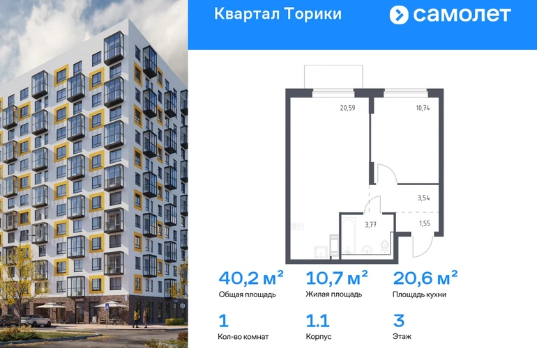 Предлагается 1-комнатная квартира комфорт-класса 40,19 кв.м в корпусе 1.1 на 3 этаже, в ЖК «Квартал Торики» Квартира без отделки. Доступность опции «отделка» и возможность комплектации мебелью и декором уточняйте у застройщика. Приобрести квартиру возможно по специальным акциям от застройщика, с текущими условиями акций можно ознакомиться в блоке «Акций». Цена динамическая и может отличаться, уточняйте актуальность у застройщика. Жилой комплекс «Квартал Торики» — комфортное место для семьи. Из окон открывается голубое небо, а все необходимое находится рядом. До центра Санкт-Петербурга — 40 минут на авто, до метро «Проспект Ветеранов» — 20 минут, рядом три автобусные остановки. Всего 15–20 минут пешком до Гореловского озера для прогулок и пикников. Полежаевский и Южно-Приморский парки подходят для выгула собак, а набережная канала реки Дудергофки — для велосипедных прогулок. В квартале откроются школа на 525 мест и 2 детских сада на 160 и 180 мест. Утро можно начать в кофейне на первом этаже, а вечером — закупить продуктов. Современные монолитные дома высотой 11–13 этажей выполнены в спокойной цветовой гамме с яркими акцентами. Дворы с уютными «лесными гостиными» закрыты для посторонних — дети на игровых площадках будут в безопасности. На территории есть 3 многоуровневых паркинга. Входы в подъезды без ступенек, предусмотрены кладовые и помещения для колясок и велосипедов. Квартиры сдаются без отделки.#yan19-2r1802579#О застройщике