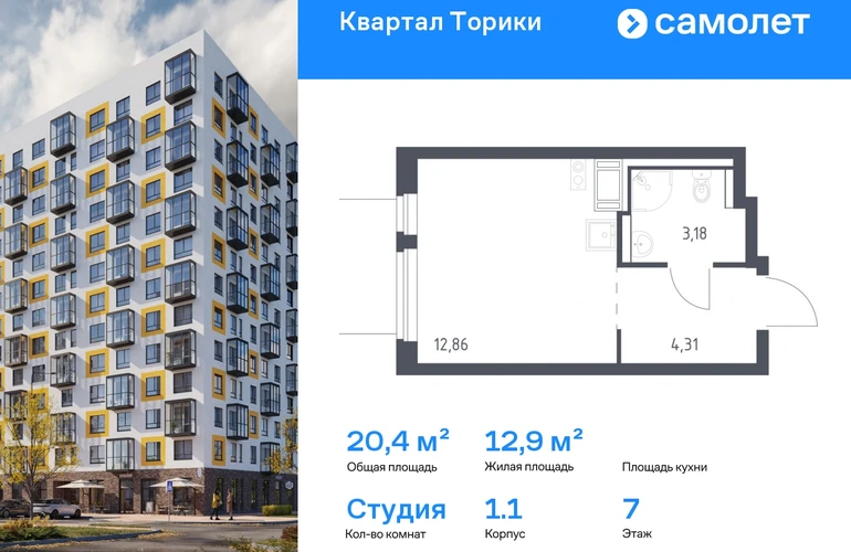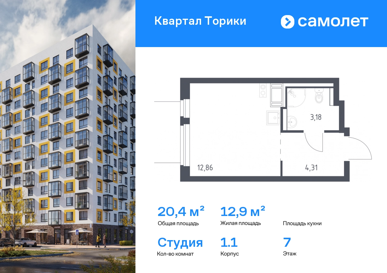 Предлагается квартира студия комфорт-класса 20,35 кв.м в корпусе 1.1 на 7 этаже, в ЖК «Квартал Торики» Квартира с чистовой отделкой. Доступность дополнительных опций уточняйте у застройщика. Приобрести квартиру возможно по специальным акциям от застройщика, с текущими условиями акций можно ознакомиться в блоке «Акций». Цена динамическая и может отличаться, уточняйте актуальность у застройщика. Жилой комплекс «Квартал Торики» — комфортное место для семьи. Из окон открывается голубое небо, а все необходимое находится рядом. До центра Санкт-Петербурга — 40 минут на авто, до метро «Проспект Ветеранов» — 20 минут, рядом три автобусные остановки. Всего 15–20 минут пешком до Гореловского озера для прогулок и пикников. Полежаевский и Южно-Приморский парки подходят для выгула собак, а набережная канала реки Дудергофки — для велосипедных прогулок. В квартале откроются школа на 525 мест и 2 детских сада на 160 и 180 мест. Утро можно начать в кофейне на первом этаже, а вечером — закупить продуктов. Современные монолитные дома высотой 11–13 этажей выполнены в спокойной цветовой гамме с яркими акцентами. Дворы с уютными «лесными гостиными» закрыты для посторонних — дети на игровых площадках будут в безопасности. На территории есть 3 многоуровневых паркинга. Входы в подъезды без ступенек, предусмотрены кладовые и помещения для колясок и велосипедов. Квартиры сдаются без отделки.#yan19-2r1804476#О застройщике