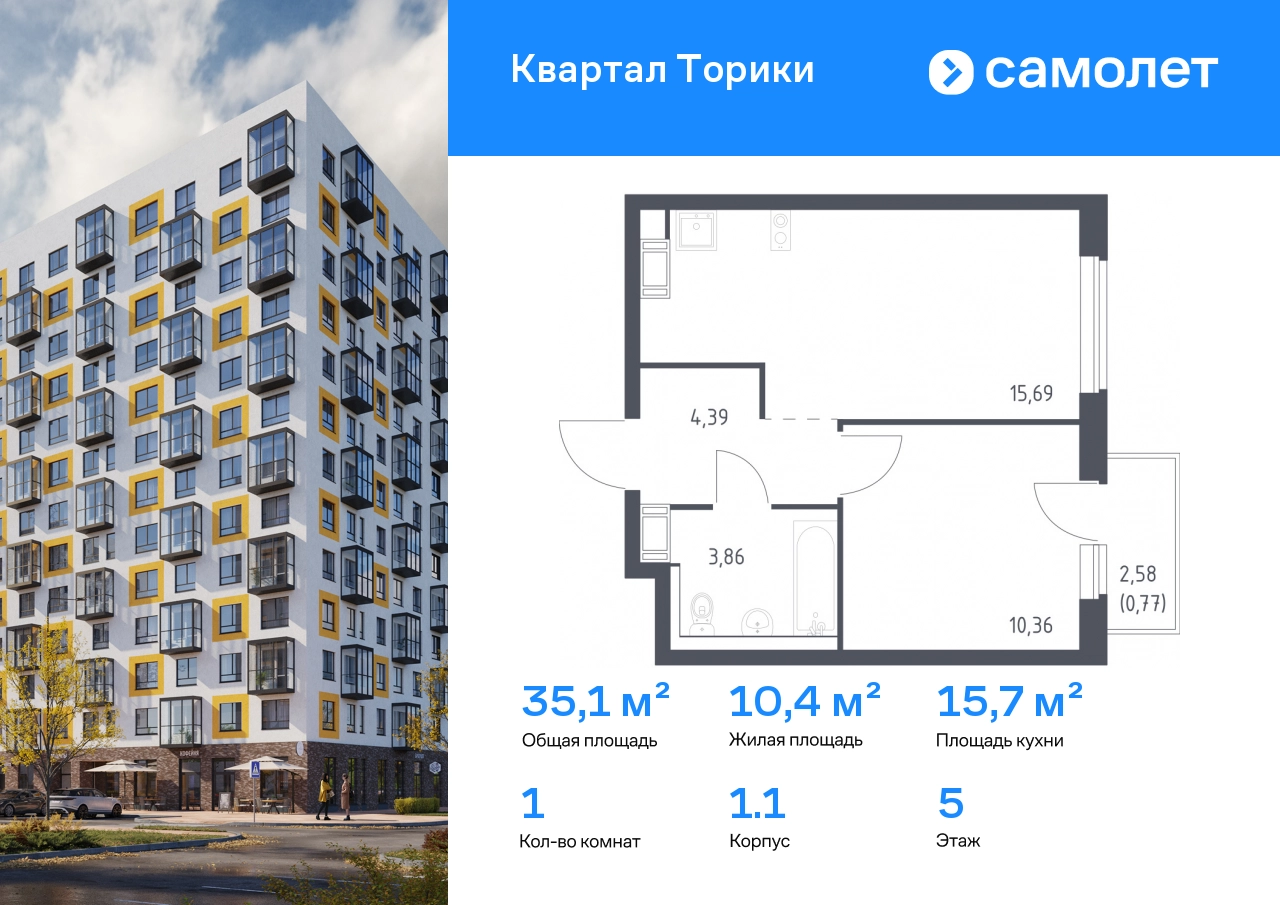 Предлагается 1-комнатная квартира комфорт-класса 35,07 кв.м в корпусе 1.1 на 5 этаже, в ЖК «Квартал Торики» Квартира с чистовой отделкой. Доступность дополнительных опций уточняйте у застройщика. Приобрести квартиру возможно по специальным акциям от застройщика, с текущими условиями акций можно ознакомиться в блоке «Акций». Цена динамическая и может отличаться, уточняйте актуальность у застройщика. Жилой комплекс «Квартал Торики» — комфортное место для семьи. Из окон открывается голубое небо, а все необходимое находится рядом. До центра Санкт-Петербурга — 40 минут на авто, до метро «Проспект Ветеранов» — 20 минут, рядом три автобусные остановки. Всего 15–20 минут пешком до Гореловского озера для прогулок и пикников. Полежаевский и Южно-Приморский парки подходят для выгула собак, а набережная канала реки Дудергофки — для велосипедных прогулок. В квартале откроются школа на 525 мест и 2 детских сада на 160 и 180 мест. Утро можно начать в кофейне на первом этаже, а вечером — закупить продуктов. Современные монолитные дома высотой 11–13 этажей выполнены в спокойной цветовой гамме с яркими акцентами. Дворы с уютными «лесными гостиными» закрыты для посторонних — дети на игровых площадках будут в безопасности. На территории есть 3 многоуровневых паркинга. Входы в подъезды без ступенек, предусмотрены кладовые и помещения для колясок и велосипедов. Квартиры сдаются без отделки.#yan19-2r1805463#О застройщике