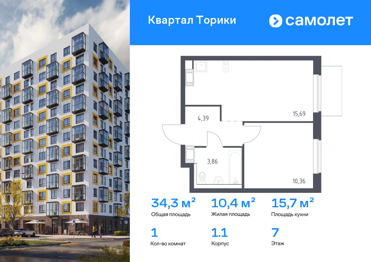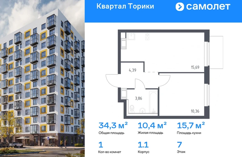 Предлагается 1-комнатная квартира комфорт-класса 34,3 кв.м в корпусе 1.1 на 7 этаже, в ЖК «Квартал Торики» Квартира с чистовой отделкой. Доступность дополнительных опций уточняйте у застройщика. Приобрести квартиру возможно по специальным акциям от застройщика, с текущими условиями акций можно ознакомиться в блоке «Акций». Цена динамическая и может отличаться, уточняйте актуальность у застройщика. Жилой комплекс «Квартал Торики» — комфортное место для семьи. Из окон открывается голубое небо, а все необходимое находится рядом. До центра Санкт-Петербурга — 40 минут на авто, до метро «Проспект Ветеранов» — 20 минут, рядом три автобусные остановки. Всего 15–20 минут пешком до Гореловского озера для прогулок и пикников. Полежаевский и Южно-Приморский парки подходят для выгула собак, а набережная канала реки Дудергофки — для велосипедных прогулок. В квартале откроются школа на 525 мест и 2 детских сада на 160 и 180 мест. Утро можно начать в кофейне на первом этаже, а вечером — закупить продуктов. Современные монолитные дома высотой 11–13 этажей выполнены в спокойной цветовой гамме с яркими акцентами. Дворы с уютными «лесными гостиными» закрыты для посторонних — дети на игровых площадках будут в безопасности. На территории есть 3 многоуровневых паркинга. Входы в подъезды без ступенек, предусмотрены кладовые и помещения для колясок и велосипедов. Квартиры сдаются без отделки.#yan19-2r1805464#О застройщике
