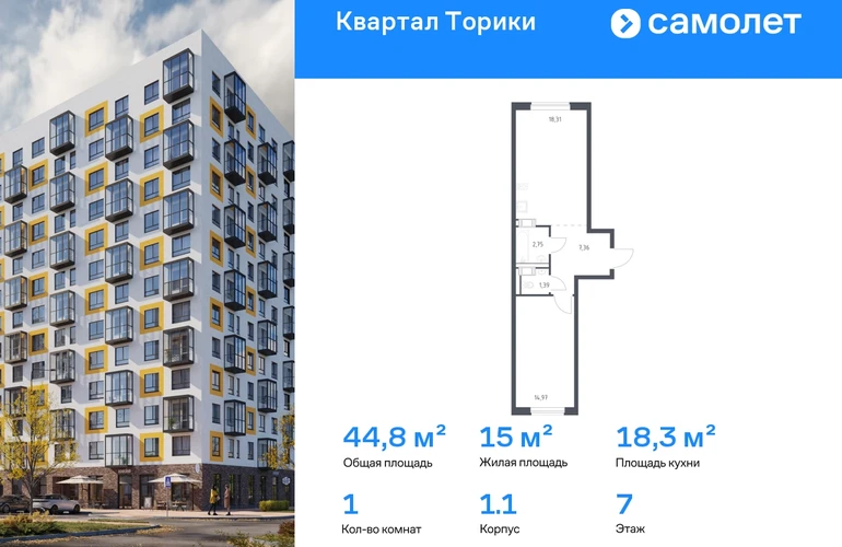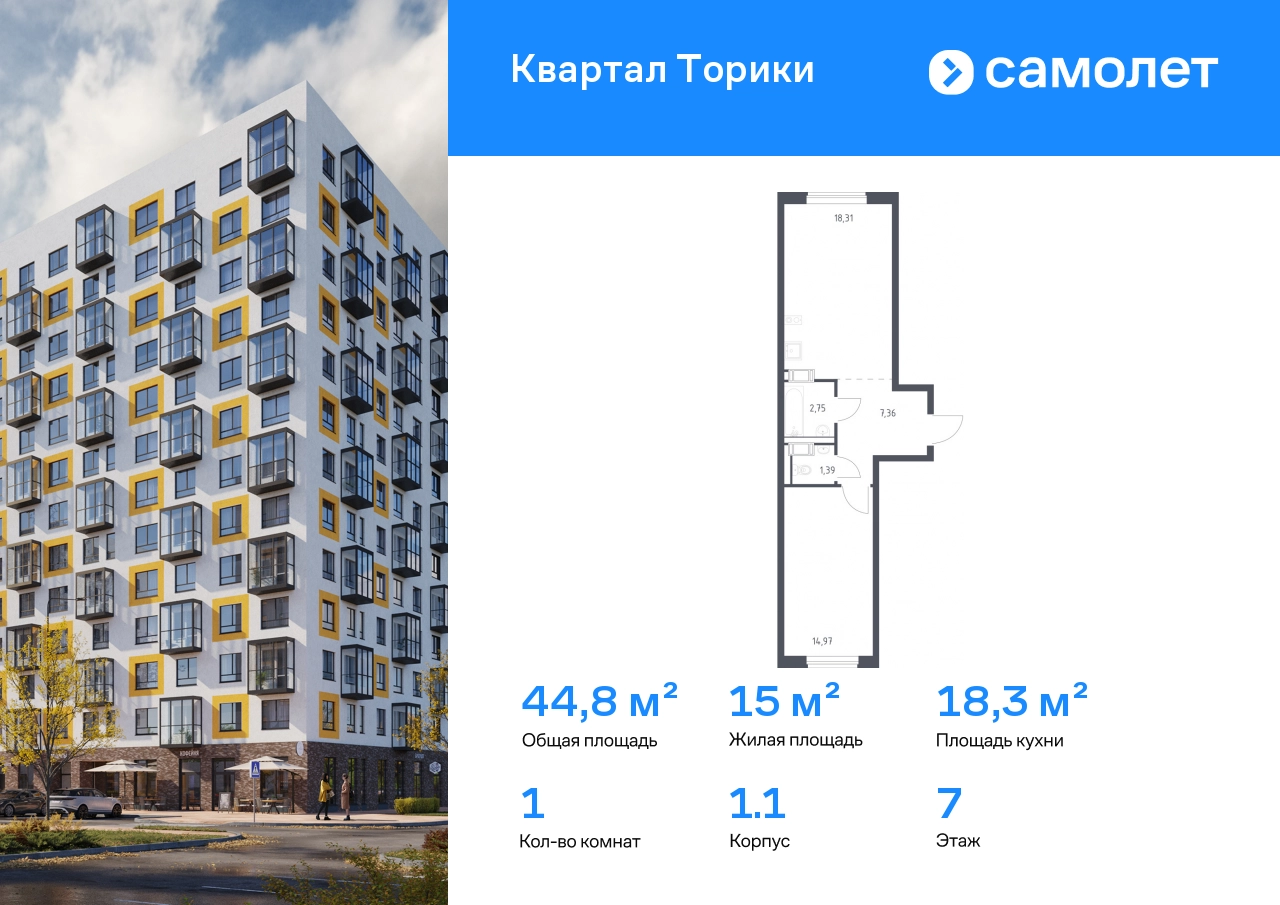 Предлагается 1-комнатная квартира комфорт-класса 44,78 кв.м в корпусе 1.1 на 7 этаже, в ЖК «Квартал Торики» Квартира с чистовой отделкой. Доступность дополнительных опций уточняйте у застройщика. Приобрести квартиру возможно по специальным акциям от застройщика, с текущими условиями акций можно ознакомиться в блоке «Акций». Цена динамическая и может отличаться, уточняйте актуальность у застройщика. Жилой комплекс «Квартал Торики» — комфортное место для семьи. Из окон открывается голубое небо, а все необходимое находится рядом. До центра Санкт-Петербурга — 40 минут на авто, до метро «Проспект Ветеранов» — 20 минут, рядом три автобусные остановки. Всего 15–20 минут пешком до Гореловского озера для прогулок и пикников. Полежаевский и Южно-Приморский парки подходят для выгула собак, а набережная канала реки Дудергофки — для велосипедных прогулок. В квартале откроются школа на 525 мест и 2 детских сада на 160 и 180 мест. Утро можно начать в кофейне на первом этаже, а вечером — закупить продуктов. Современные монолитные дома высотой 11–13 этажей выполнены в спокойной цветовой гамме с яркими акцентами. Дворы с уютными «лесными гостиными» закрыты для посторонних — дети на игровых площадках будут в безопасности. На территории есть 3 многоуровневых паркинга. Входы в подъезды без ступенек, предусмотрены кладовые и помещения для колясок и велосипедов. Квартиры сдаются без отделки.#yan19-2r1806426#О застройщике