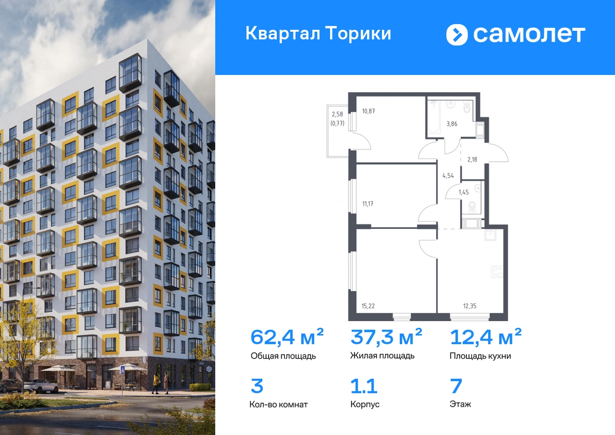 Предлагается 3-комнатная квартира комфорт-класса 62,41 кв.м в корпусе 1.1 на 7 этаже, в ЖК «Квартал Торики» Квартира с чистовой отделкой. Доступность дополнительных опций уточняйте у застройщика. Приобрести квартиру возможно по специальным акциям от застройщика, с текущими условиями акций можно ознакомиться в блоке «Акций». Цена динамическая и может отличаться, уточняйте актуальность у застройщика. Жилой комплекс «Квартал Торики» — комфортное место для семьи. Из окон открывается голубое небо, а все необходимое находится рядом. До центра Санкт-Петербурга — 40 минут на авто, до метро «Проспект Ветеранов» — 20 минут, рядом три автобусные остановки. Всего 15–20 минут пешком до Гореловского озера для прогулок и пикников. Полежаевский и Южно-Приморский парки подходят для выгула собак, а набережная канала реки Дудергофки — для велосипедных прогулок. В квартале откроются школа на 525 мест и 2 детских сада на 160 и 180 мест. Утро можно начать в кофейне на первом этаже, а вечером — закупить продуктов. Современные монолитные дома высотой 11–13 этажей выполнены в спокойной цветовой гамме с яркими акцентами. Дворы с уютными «лесными гостиными» закрыты для посторонних — дети на игровых площадках будут в безопасности. На территории есть 3 многоуровневых паркинга. Входы в подъезды без ступенек, предусмотрены кладовые и помещения для колясок и велосипедов. Квартиры сдаются без отделки.#yan19-2r1807804#О застройщике