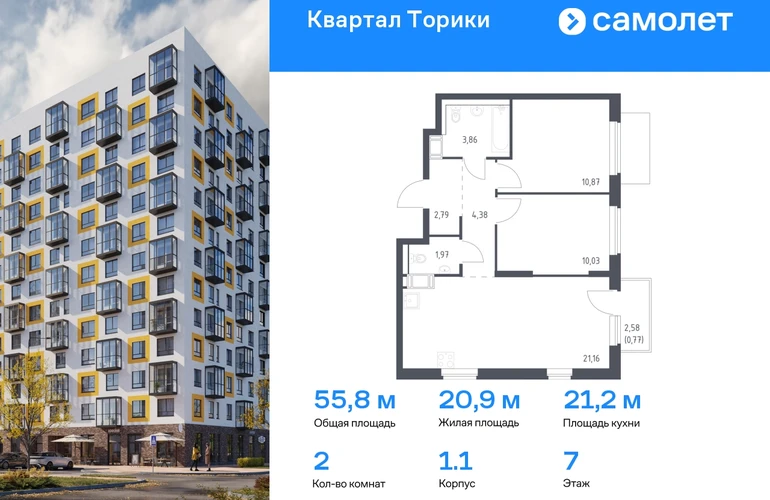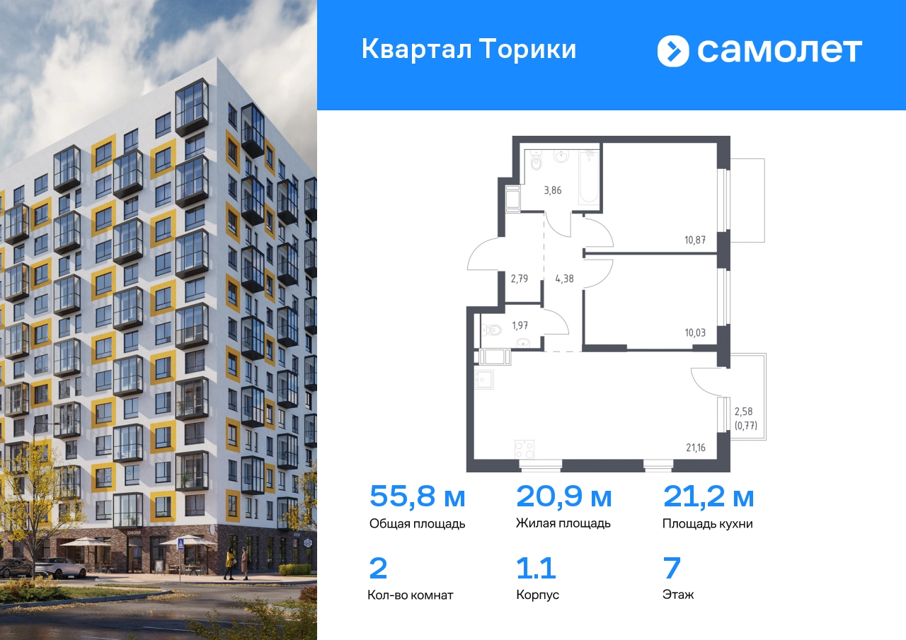 Предлагается 2-комнатная квартира комфорт-класса 55,83 кв.м в корпусе 1.1 на 7 этаже, в ЖК «Квартал Торики» Квартира с чистовой отделкой. Доступность дополнительных опций уточняйте у застройщика. Приобрести квартиру возможно по специальным акциям от застройщика, с текущими условиями акций можно ознакомиться в блоке «Акций». Цена динамическая и может отличаться, уточняйте актуальность у застройщика. Жилой комплекс «Квартал Торики» — комфортное место для семьи. Из окон открывается голубое небо, а все необходимое находится рядом. До центра Санкт-Петербурга — 40 минут на авто, до метро «Проспект Ветеранов» — 20 минут, рядом три автобусные остановки. Всего 15–20 минут пешком до Гореловского озера для прогулок и пикников. Полежаевский и Южно-Приморский парки подходят для выгула собак, а набережная канала реки Дудергофки — для велосипедных прогулок. В квартале откроются школа на 525 мест и 2 детских сада на 160 и 180 мест. Утро можно начать в кофейне на первом этаже, а вечером — закупить продуктов. Современные монолитные дома высотой 11–13 этажей выполнены в спокойной цветовой гамме с яркими акцентами. Дворы с уютными «лесными гостиными» закрыты для посторонних — дети на игровых площадках будут в безопасности. На территории есть 3 многоуровневых паркинга. Входы в подъезды без ступенек, предусмотрены кладовые и помещения для колясок и велосипедов. Квартиры сдаются без отделки.#yan19-2r1810361#О застройщике