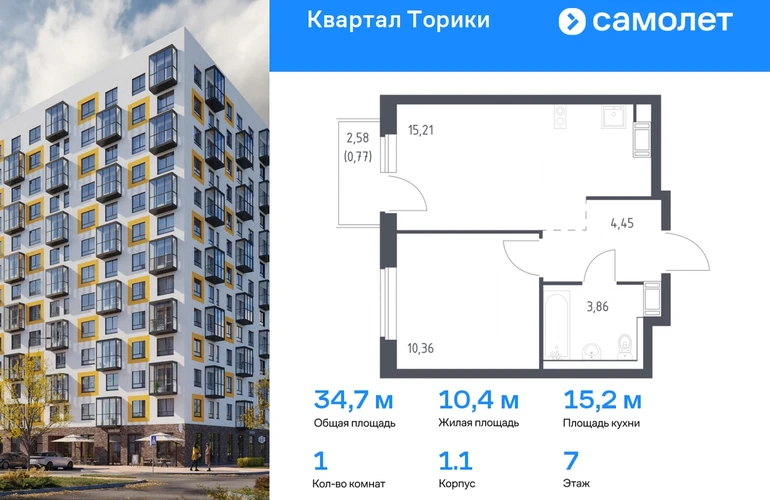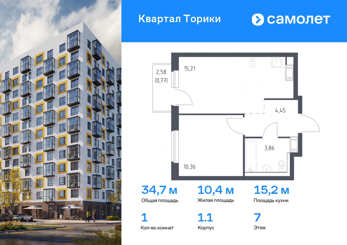 Предлагается 1-комнатная квартира комфорт-класса 34,65 кв.м в корпусе 1.1 на 7 этаже, в ЖК «Квартал Торики» Квартира с чистовой отделкой. Доступность дополнительных опций уточняйте у застройщика. Приобрести квартиру возможно по специальным акциям от застройщика, с текущими условиями акций можно ознакомиться в блоке «Акций». Цена динамическая и может отличаться, уточняйте актуальность у застройщика. Жилой комплекс «Квартал Торики» — комфортное место для семьи. Из окон открывается голубое небо, а все необходимое находится рядом. До центра Санкт-Петербурга — 40 минут на авто, до метро «Проспект Ветеранов» — 20 минут, рядом три автобусные остановки. Всего 15–20 минут пешком до Гореловского озера для прогулок и пикников. Полежаевский и Южно-Приморский парки подходят для выгула собак, а набережная канала реки Дудергофки — для велосипедных прогулок. В квартале откроются школа на 525 мест и 2 детских сада на 160 и 180 мест. Утро можно начать в кофейне на первом этаже, а вечером — закупить продуктов. Современные монолитные дома высотой 11–13 этажей выполнены в спокойной цветовой гамме с яркими акцентами. Дворы с уютными «лесными гостиными» закрыты для посторонних — дети на игровых площадках будут в безопасности. На территории есть 3 многоуровневых паркинга. Входы в подъезды без ступенек, предусмотрены кладовые и помещения для колясок и велосипедов. Квартиры сдаются без отделки.#yan19-2r1810593#О застройщике