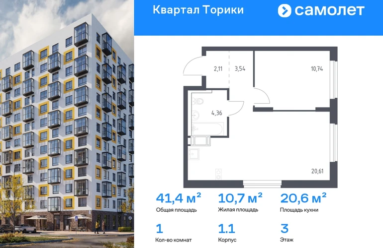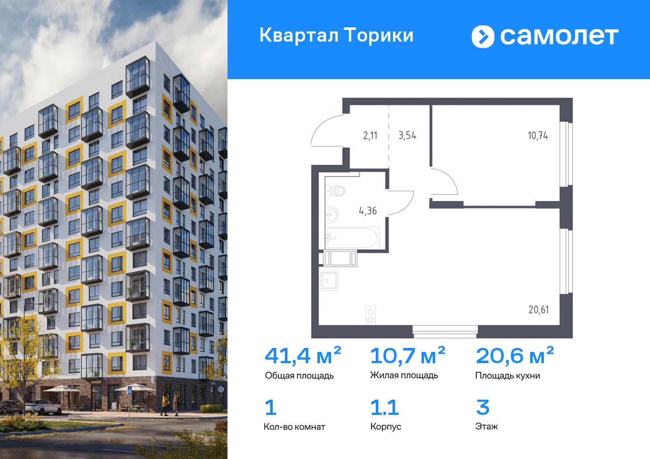 Предлагается 1-комнатная квартира комфорт-класса 41,36 кв.м в корпусе 1.1 на 3 этаже, в ЖК «Квартал Торики» Квартира с предчистовой отделкой. Доступность дополнительных опций уточняйте у застройщика. Приобрести квартиру возможно по специальным акциям от застройщика, с текущими условиями акций можно ознакомиться в блоке «Акций». Цена динамическая и может отличаться, уточняйте актуальность у застройщика. Жилой комплекс «Квартал Торики» — комфортное место для семьи. Из окон открывается голубое небо, а все необходимое находится рядом. До центра Санкт-Петербурга — 40 минут на авто, до метро «Проспект Ветеранов» — 20 минут, рядом три автобусные остановки. Всего 15–20 минут пешком до Гореловского озера для прогулок и пикников. Полежаевский и Южно-Приморский парки подходят для выгула собак, а набережная канала реки Дудергофки — для велосипедных прогулок. В квартале откроются школа на 525 мест и 2 детских сада на 160 и 180 мест. Утро можно начать в кофейне на первом этаже, а вечером — закупить продуктов. Современные монолитные дома высотой 11–13 этажей выполнены в спокойной цветовой гамме с яркими акцентами. Дворы с уютными «лесными гостиными» закрыты для посторонних — дети на игровых площадках будут в безопасности. На территории есть 3 многоуровневых паркинга. Входы в подъезды без ступенек, предусмотрены кладовые и помещения для колясок и велосипедов. Квартиры сдаются без отделки.#yan19-2r1812249#О застройщике