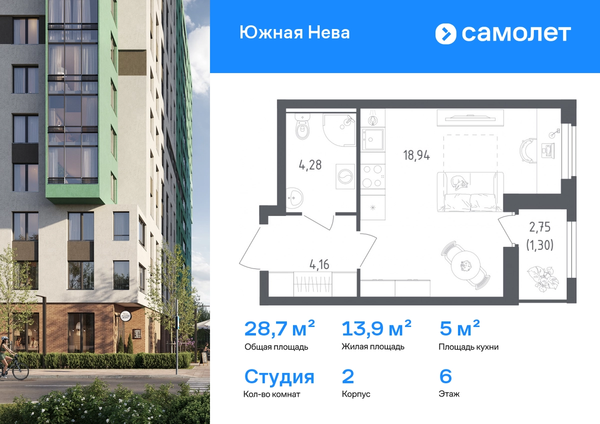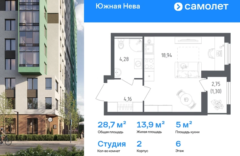 Предлагается квартира студия комфорт-класса 28,68 кв.м в корпусе 2 на 6 этаже, в ЖК «Южная Нева» Квартира с чистовой отделкой. Доступность дополнительных опций уточняйте у застройщика. Приобрести квартиру возможно по специальным акциям от застройщика, с текущими условиями акций можно ознакомиться в блоке «Акций». Цена динамическая и может отличаться, уточняйте актуальность у застройщика. Спокойное течение Невы, монументальные арки Володарского моста и простор лесопарка создают атмосферу жилого комплекса «Южная Нева». До КАДа — всего 5 минут, до центра города — 30 минут на машине, а станция метро «Пролетарская» в 10 минутах. Для любителей природы рядом Невский лесопарк и «МЕГА Парк», где можно бегать, кататься на велосипеде или посетить веревочный парк. Для детей предусмотрены школа и 2 детских сада, а на первых этажах домов откроются салоны красоты, магазины и кафе. В шаговой доступности — фитнес-центр и торговые центры «МЕГА Дыбенко» и «Лондон Молл». Комплекс состоит из 11 монолитных домов высотой от 12 до 23 этажей с разноцветными фасадами и панорамными балконами. Двор украшают 7 мостов-навесов, а центральная аллея — собственная Нева. Здесь можно позагорать на лежаках или поиграть в шахматы, позаниматься на спортивной площадке или отвести ребенка в игровую зону на встречу с друзьями. В «Южной Неве» есть планировки с проходными кухнями-гостиными и гардеробными.#yan19-2r1719200#О застройщике