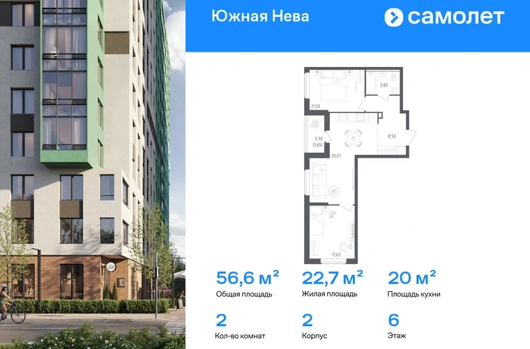 Предлагается 2-комнатная квартира комфорт-класса 56,61 кв.м в корпусе 2 на 6 этаже, в ЖК «Южная Нева» Квартира с чистовой отделкой. Доступность дополнительных опций уточняйте у застройщика. Приобрести квартиру возможно по специальным акциям от застройщика, с текущими условиями акций можно ознакомиться в блоке «Акций». Цена динамическая и может отличаться, уточняйте актуальность у застройщика. Спокойное течение Невы, монументальные арки Володарского моста и простор лесопарка создают атмосферу жилого комплекса «Южная Нева». До КАДа — всего 5 минут, до центра города — 30 минут на машине, а станция метро «Пролетарская» в 10 минутах. Для любителей природы рядом Невский лесопарк и «МЕГА Парк», где можно бегать, кататься на велосипеде или посетить веревочный парк. Для детей предусмотрены школа и 2 детских сада, а на первых этажах домов откроются салоны красоты, магазины и кафе. В шаговой доступности — фитнес-центр и торговые центры «МЕГА Дыбенко» и «Лондон Молл». Комплекс состоит из 11 монолитных домов высотой от 12 до 23 этажей с разноцветными фасадами и панорамными балконами. Двор украшают 7 мостов-навесов, а центральная аллея — собственная Нева. Здесь можно позагорать на лежаках или поиграть в шахматы, позаниматься на спортивной площадке или отвести ребенка в игровую зону на встречу с друзьями. В «Южной Неве» есть планировки с проходными кухнями-гостиными и гардеробными.#yan19-2r1719263#О застройщике