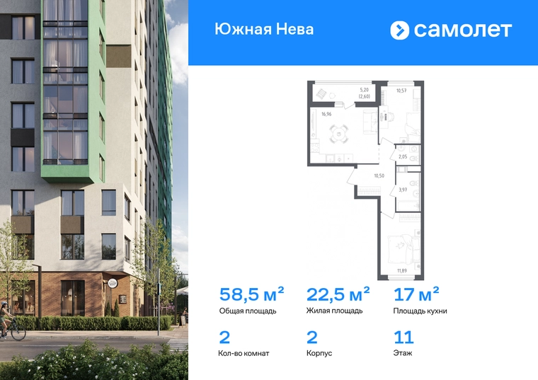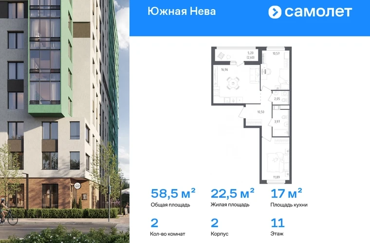 Предлагается 2-комнатная квартира комфорт-класса 58,54 кв.м в корпусе 2 на 11 этаже, в ЖК «Южная Нева» Квартира без отделки. Доступность опции «отделка» и возможность комплектации мебелью и декором уточняйте у застройщика. Приобрести квартиру возможно по специальным акциям от застройщика, с текущими условиями акций можно ознакомиться в блоке «Акций». Цена динамическая и может отличаться, уточняйте актуальность у застройщика. Спокойное течение Невы, монументальные арки Володарского моста и простор лесопарка создают атмосферу жилого комплекса «Южная Нева». До КАДа — всего 5 минут, до центра города — 30 минут на машине, а станция метро «Пролетарская» в 10 минутах. Для любителей природы рядом Невский лесопарк и «МЕГА Парк», где можно бегать, кататься на велосипеде или посетить веревочный парк. Для детей предусмотрены школа и 2 детских сада, а на первых этажах домов откроются салоны красоты, магазины и кафе. В шаговой доступности — фитнес-центр и торговые центры «МЕГА Дыбенко» и «Лондон Молл». Комплекс состоит из 11 монолитных домов высотой от 12 до 23 этажей с разноцветными фасадами и панорамными балконами. Двор украшают 7 мостов-навесов, а центральная аллея — собственная Нева. Здесь можно позагорать на лежаках или поиграть в шахматы, позаниматься на спортивной площадке или отвести ребенка в игровую зону на встречу с друзьями. В «Южной Неве» есть планировки с проходными кухнями-гостиными и гардеробными.#yan19-2r1743648#О застройщике