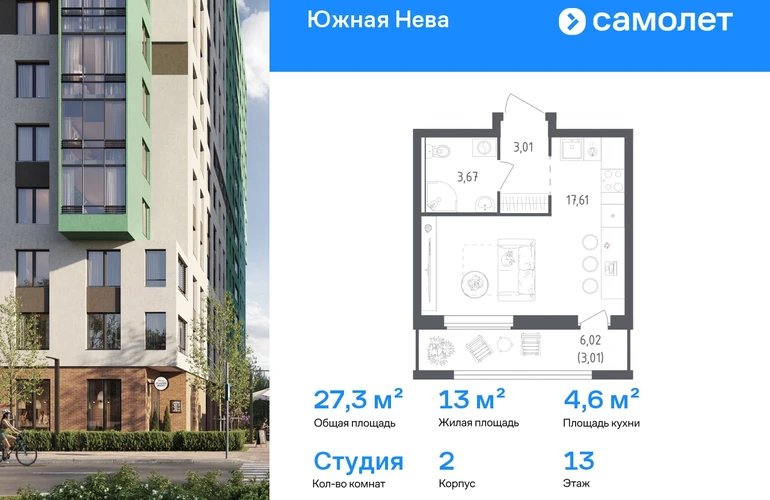 Предлагается квартира студия комфорт-класса 27,3 кв.м в корпусе 2 на 13 этаже, в ЖК «Южная Нева» Квартира с предчистовой отделкой. Доступность дополнительных опций уточняйте у застройщика. Приобрести квартиру возможно по специальным акциям от застройщика, с текущими условиями акций можно ознакомиться в блоке «Акций». Цена динамическая и может отличаться, уточняйте актуальность у застройщика. Спокойное течение Невы, монументальные арки Володарского моста и простор лесопарка создают атмосферу жилого комплекса «Южная Нева». До КАДа — всего 5 минут, до центра города — 30 минут на машине, а станция метро «Пролетарская» в 10 минутах. Для любителей природы рядом Невский лесопарк и «МЕГА Парк», где можно бегать, кататься на велосипеде или посетить веревочный парк. Для детей предусмотрены школа и 2 детских сада, а на первых этажах домов откроются салоны красоты, магазины и кафе. В шаговой доступности — фитнес-центр и торговые центры «МЕГА Дыбенко» и «Лондон Молл». Комплекс состоит из 11 монолитных домов высотой от 12 до 23 этажей с разноцветными фасадами и панорамными балконами. Двор украшают 7 мостов-навесов, а центральная аллея — собственная Нева. Здесь можно позагорать на лежаках или поиграть в шахматы, позаниматься на спортивной площадке или отвести ребенка в игровую зону на встречу с друзьями. В «Южной Неве» есть планировки с проходными кухнями-гостиными и гардеробными.#yan19-2r1805462#О застройщике