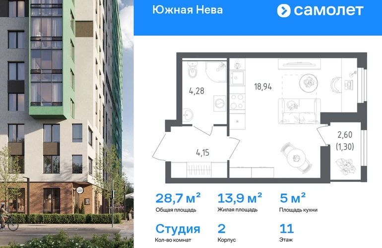 Предлагается квартира студия комфорт-класса 28,67 кв.м в корпусе 2 на 11 этаже, в ЖК «Южная Нева» Квартира с чистовой отделкой. Доступность дополнительных опций уточняйте у застройщика. Приобрести квартиру возможно по специальным акциям от застройщика, с текущими условиями акций можно ознакомиться в блоке «Акций». Цена динамическая и может отличаться, уточняйте актуальность у застройщика. Спокойное течение Невы, монументальные арки Володарского моста и простор лесопарка создают атмосферу жилого комплекса «Южная Нева». До КАДа — всего 5 минут, до центра города — 30 минут на машине, а станция метро «Пролетарская» в 10 минутах. Для любителей природы рядом Невский лесопарк и «МЕГА Парк», где можно бегать, кататься на велосипеде или посетить веревочный парк. Для детей предусмотрены школа и 2 детских сада, а на первых этажах домов откроются салоны красоты, магазины и кафе. В шаговой доступности — фитнес-центр и торговые центры «МЕГА Дыбенко» и «Лондон Молл». Комплекс состоит из 11 монолитных домов высотой от 12 до 23 этажей с разноцветными фасадами и панорамными балконами. Двор украшают 7 мостов-навесов, а центральная аллея — собственная Нева. Здесь можно позагорать на лежаках или поиграть в шахматы, позаниматься на спортивной площадке или отвести ребенка в игровую зону на встречу с друзьями. В «Южной Неве» есть планировки с проходными кухнями-гостиными и гардеробными.#yan19-2r1807400#О застройщике