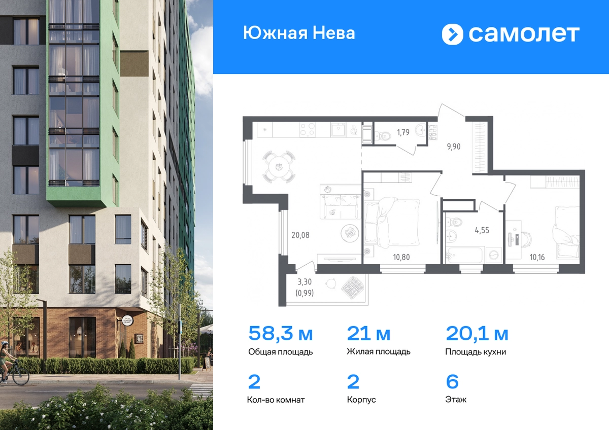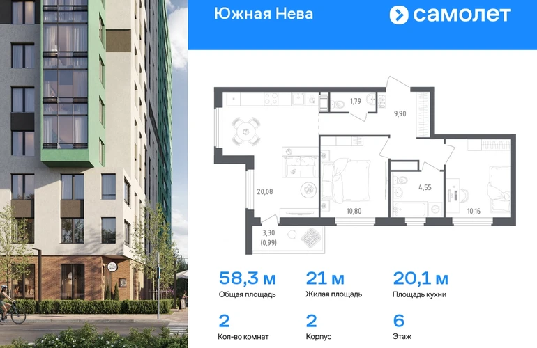 Предлагается 2-комнатная квартира комфорт-класса 58,27 кв.м в корпусе 2 на 6 этаже, в ЖК «Южная Нева» Квартира с чистовой отделкой. Доступность дополнительных опций уточняйте у застройщика. Приобрести квартиру возможно по специальным акциям от застройщика, с текущими условиями акций можно ознакомиться в блоке «Акций». Цена динамическая и может отличаться, уточняйте актуальность у застройщика. Спокойное течение Невы, монументальные арки Володарского моста и простор лесопарка создают атмосферу жилого комплекса «Южная Нева». До КАДа — всего 5 минут, до центра города — 30 минут на машине, а станция метро «Пролетарская» в 10 минутах. Для любителей природы рядом Невский лесопарк и «МЕГА Парк», где можно бегать, кататься на велосипеде или посетить веревочный парк. Для детей предусмотрены школа и 2 детских сада, а на первых этажах домов откроются салоны красоты, магазины и кафе. В шаговой доступности — фитнес-центр и торговые центры «МЕГА Дыбенко» и «Лондон Молл». Комплекс состоит из 11 монолитных домов высотой от 12 до 23 этажей с разноцветными фасадами и панорамными балконами. Двор украшают 7 мостов-навесов, а центральная аллея — собственная Нева. Здесь можно позагорать на лежаках или поиграть в шахматы, позаниматься на спортивной площадке или отвести ребенка в игровую зону на встречу с друзьями. В «Южной Неве» есть планировки с проходными кухнями-гостиными и гардеробными.#yan19-2r1810360#О застройщике