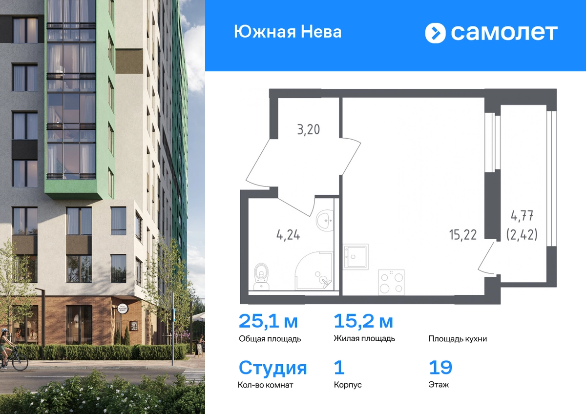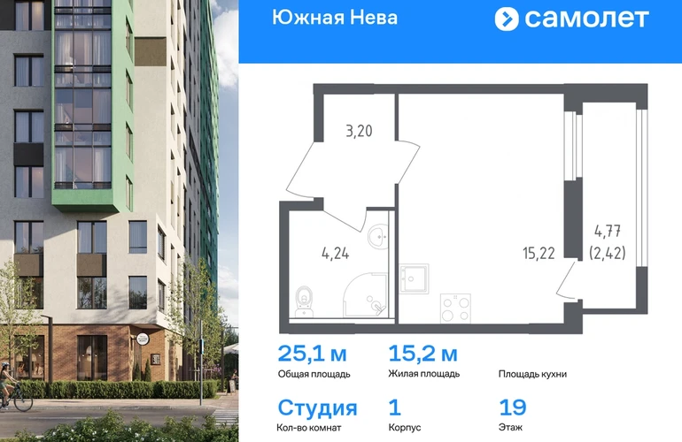Предлагается квартира студия комфорт-класса 25,08 кв.м в корпусе 1 на 19 этаже, в ЖК «Южная Нева» Квартира с чистовой отделкой. Доступность дополнительных опций уточняйте у застройщика. Приобрести квартиру возможно по специальным акциям от застройщика, с текущими условиями акций можно ознакомиться в блоке «Акций». Цена динамическая и может отличаться, уточняйте актуальность у застройщика. Спокойное течение Невы, монументальные арки Володарского моста и простор лесопарка создают атмосферу жилого комплекса «Южная Нева». До КАДа — всего 5 минут, до центра города — 30 минут на машине, а станция метро «Пролетарская» в 10 минутах. Для любителей природы рядом Невский лесопарк и «МЕГА Парк», где можно бегать, кататься на велосипеде или посетить веревочный парк. Для детей предусмотрены школа и 2 детских сада, а на первых этажах домов откроются салоны красоты, магазины и кафе. В шаговой доступности — фитнес-центр и торговые центры «МЕГА Дыбенко» и «Лондон Молл». Комплекс состоит из 11 монолитных домов высотой от 12 до 23 этажей с разноцветными фасадами и панорамными балконами. Двор украшают 7 мостов-навесов, а центральная аллея — собственная Нева. Здесь можно позагорать на лежаках или поиграть в шахматы, позаниматься на спортивной площадке или отвести ребенка в игровую зону на встречу с друзьями. В «Южной Неве» есть планировки с проходными кухнями-гостиными и гардеробными.#yan19-2r1810587#О застройщике