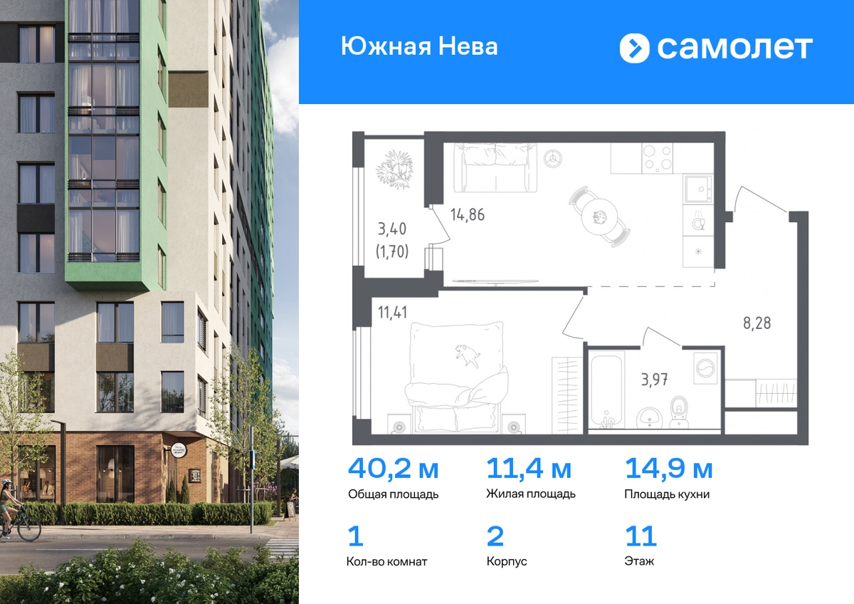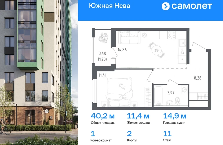 Предлагается 1-комнатная квартира комфорт-класса 40,22 кв.м в корпусе 2 на 11 этаже, в ЖК «Южная Нева» Квартира с чистовой отделкой. Доступность дополнительных опций уточняйте у застройщика. Приобрести квартиру возможно по специальным акциям от застройщика, с текущими условиями акций можно ознакомиться в блоке «Акций». Цена динамическая и может отличаться, уточняйте актуальность у застройщика. Спокойное течение Невы, монументальные арки Володарского моста и простор лесопарка создают атмосферу жилого комплекса «Южная Нева». До КАДа — всего 5 минут, до центра города — 30 минут на машине, а станция метро «Пролетарская» в 10 минутах. Для любителей природы рядом Невский лесопарк и «МЕГА Парк», где можно бегать, кататься на велосипеде или посетить веревочный парк. Для детей предусмотрены школа и 2 детских сада, а на первых этажах домов откроются салоны красоты, магазины и кафе. В шаговой доступности — фитнес-центр и торговые центры «МЕГА Дыбенко» и «Лондон Молл». Комплекс состоит из 11 монолитных домов высотой от 12 до 23 этажей с разноцветными фасадами и панорамными балконами. Двор украшают 7 мостов-навесов, а центральная аллея — собственная Нева. Здесь можно позагорать на лежаках или поиграть в шахматы, позаниматься на спортивной площадке или отвести ребенка в игровую зону на встречу с друзьями. В «Южной Неве» есть планировки с проходными кухнями-гостиными и гардеробными.#yan19-2r1810705#О застройщике