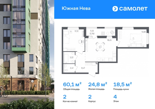 Предлагается 2-комнатная квартира комфорт-класса 60,11 кв.м в корпусе 2 на 4 этаже, в ЖК «Южная Нева» Квартира без отделки. Доступность опции «отделка» и возможность комплектации мебелью и декором уточняйте у застройщика. Приобрести квартиру возможно по специальным акциям от застройщика, с текущими условиями акций можно ознакомиться в блоке «Акций». Цена динамическая и может отличаться, уточняйте актуальность у застройщика. Спокойное течение Невы, монументальные арки Володарского моста и простор лесопарка создают атмосферу жилого комплекса «Южная Нева». До КАДа — всего 5 минут, до центра города — 30 минут на машине, а станция метро «Пролетарская» в 10 минутах. Для любителей природы рядом Невский лесопарк и «МЕГА Парк», где можно бегать, кататься на велосипеде или посетить веревочный парк. Для детей предусмотрены школа и 2 детских сада, а на первых этажах домов откроются салоны красоты, магазины и кафе. В шаговой доступности — фитнес-центр и торговые центры «МЕГА Дыбенко» и «Лондон Молл». Комплекс состоит из 11 монолитных домов высотой от 12 до 23 этажей с разноцветными фасадами и панорамными балконами. Двор украшают 7 мостов-навесов, а центральная аллея — собственная Нева. Здесь можно позагорать на лежаках или поиграть в шахматы, позаниматься на спортивной площадке или отвести ребенка в игровую зону на встречу с друзьями. В «Южной Неве» есть планировки с проходными кухнями-гостиными и гардеробными.#yan19-2r1813115#О застройщике
