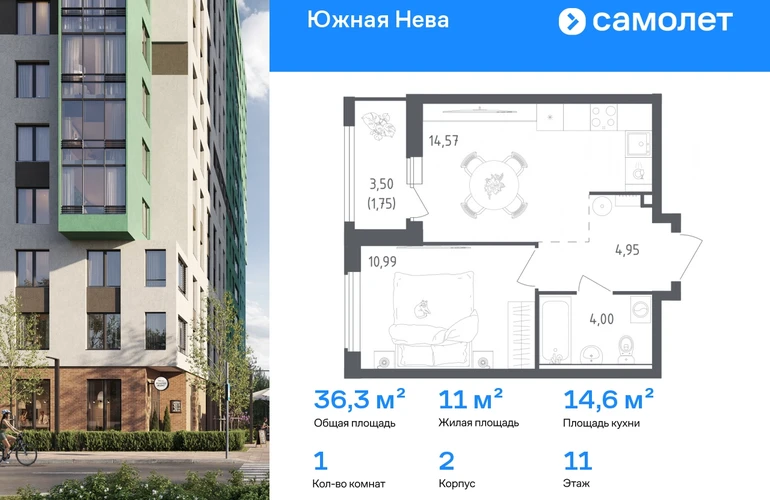 Предлагается 1-комнатная квартира комфорт-класса 36,3 кв.м в корпусе 2 на 11 этаже, в ЖК «Южная Нева» Квартира с чистовой отделкой. Доступность дополнительных опций уточняйте у застройщика. Приобрести квартиру возможно по специальным акциям от застройщика, с текущими условиями акций можно ознакомиться в блоке «Акций». Цена динамическая и может отличаться, уточняйте актуальность у застройщика. Спокойное течение Невы, монументальные арки Володарского моста и простор лесопарка создают атмосферу жилого комплекса «Южная Нева». До КАДа — всего 5 минут, до центра города — 30 минут на машине, а станция метро «Пролетарская» в 10 минутах. Для любителей природы рядом Невский лесопарк и «МЕГА Парк», где можно бегать, кататься на велосипеде или посетить веревочный парк. Для детей предусмотрены школа и 2 детских сада, а на первых этажах домов откроются салоны красоты, магазины и кафе. В шаговой доступности — фитнес-центр и торговые центры «МЕГА Дыбенко» и «Лондон Молл». Комплекс состоит из 11 монолитных домов высотой от 12 до 23 этажей с разноцветными фасадами и панорамными балконами. Двор украшают 7 мостов-навесов, а центральная аллея — собственная Нева. Здесь можно позагорать на лежаках или поиграть в шахматы, позаниматься на спортивной площадке или отвести ребенка в игровую зону на встречу с друзьями. В «Южной Неве» есть планировки с проходными кухнями-гостиными и гардеробными.#yan19-2r1814025#О застройщике