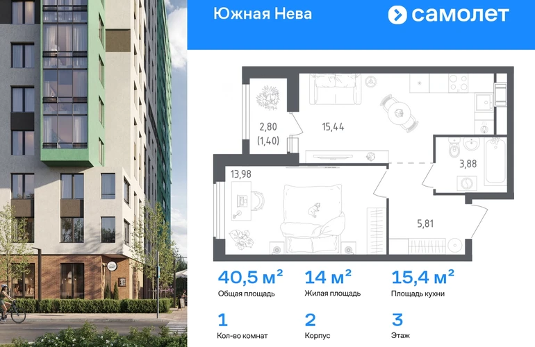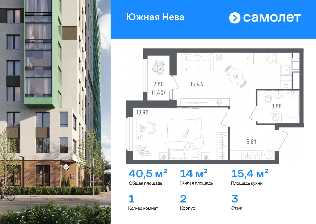 Предлагается 1-комнатная квартира комфорт-класса 40,51 кв.м в корпусе 2 на 3 этаже, в ЖК «Южная Нева» Квартира с чистовой отделкой. Доступность дополнительных опций уточняйте у застройщика. Приобрести квартиру возможно по специальным акциям от застройщика, с текущими условиями акций можно ознакомиться в блоке «Акций». Цена динамическая и может отличаться, уточняйте актуальность у застройщика. Спокойное течение Невы, монументальные арки Володарского моста и простор лесопарка создают атмосферу жилого комплекса «Южная Нева». До КАДа — всего 5 минут, до центра города — 30 минут на машине, а станция метро «Пролетарская» в 10 минутах. Для любителей природы рядом Невский лесопарк и «МЕГА Парк», где можно бегать, кататься на велосипеде или посетить веревочный парк. Для детей предусмотрены школа и 2 детских сада, а на первых этажах домов откроются салоны красоты, магазины и кафе. В шаговой доступности — фитнес-центр и торговые центры «МЕГА Дыбенко» и «Лондон Молл». Комплекс состоит из 11 монолитных домов высотой от 12 до 23 этажей с разноцветными фасадами и панорамными балконами. Двор украшают 7 мостов-навесов, а центральная аллея — собственная Нева. Здесь можно позагорать на лежаках или поиграть в шахматы, позаниматься на спортивной площадке или отвести ребенка в игровую зону на встречу с друзьями. В «Южной Неве» есть планировки с проходными кухнями-гостиными и гардеробными.#yan19-2r1814026#О застройщике