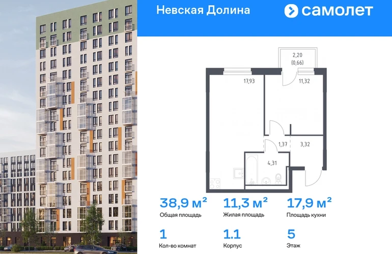 Предлагается 1-комнатная квартира комфорт-класса 38,91 кв.м в корпусе 1.1 на 5 этаже, в ЖК «Невская Долина» Квартира с предчистовой отделкой. Доступность дополнительных опций уточняйте у застройщика. Приобрести квартиру возможно по специальным акциям от застройщика, с текущими условиями акций можно ознакомиться в блоке «Акций». Цена динамическая и может отличаться, уточняйте актуальность у застройщика. «Невская Долина» — зеленый холст для вашей жизни с уникальными палисадниками, садами и уютными уголками для отдыха. Всего в 5 минутах на машине — КАД, рядом — Большой Обуховский мост. До центра Петербурга — 35 минут на авто, до метро «Пролетарская» — 15 минут, до аэропорта Пулково — 30 минут. Комплекс находится на правом берегу Невы, рядом с Невским лесопарком, «МЕГА Парком» и парком развлечений. Скоро во дворе комплекса построят 4 детских сада и 2 школы. Рядом уже есть магазины «Дикси», «Магнит», пункты выдачи и аптеки. На первых этажах будут кафе и минимаркеты, откроется медицинский центр и физкультурно-оздоровительный комплекс. Архитектура домов сочетает в себе современность и функциональность — фасады украшены большими окнами, лоджиями, обычными и французскими балконами. В «Невской Долине» есть сады плодовых культур, игровые и спортивные зоны, 11 многоуровневых паркингов.#yan19-2r1802575#О застройщике