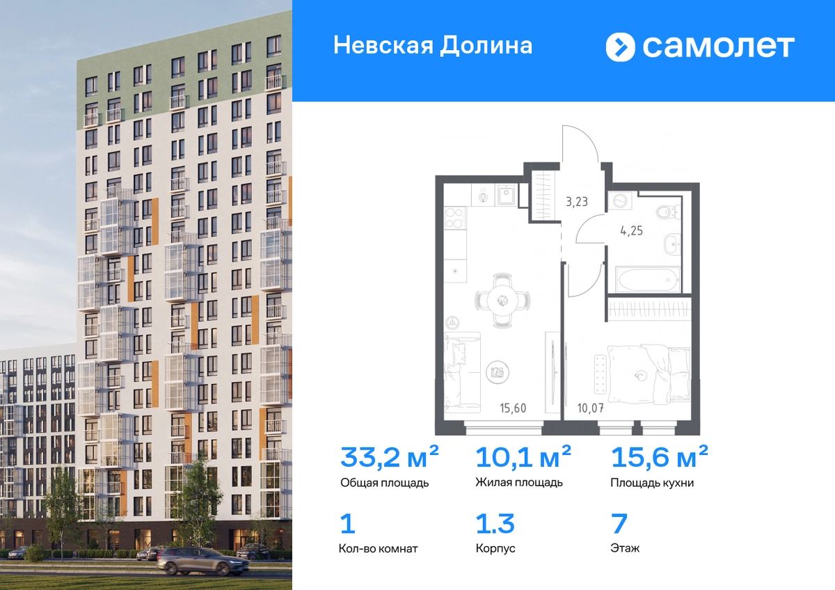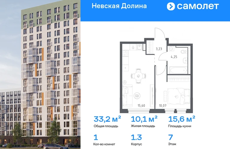 Предлагается 1-комнатная квартира комфорт-класса 33,15 кв.м в корпусе 1.3 на 7 этаже, в ЖК «Невская Долина» Квартира с чистовой отделкой. Доступность дополнительных опций уточняйте у застройщика. Приобрести квартиру возможно по специальным акциям от застройщика, с текущими условиями акций можно ознакомиться в блоке «Акций». Цена динамическая и может отличаться, уточняйте актуальность у застройщика. «Невская Долина» — зеленый холст для вашей жизни с уникальными палисадниками, садами и уютными уголками для отдыха. Всего в 5 минутах на машине — КАД, рядом — Большой Обуховский мост. До центра Петербурга — 35 минут на авто, до метро «Пролетарская» — 15 минут, до аэропорта Пулково — 30 минут. Комплекс находится на правом берегу Невы, рядом с Невским лесопарком, «МЕГА Парком» и парком развлечений. Скоро во дворе комплекса построят 4 детских сада и 2 школы. Рядом уже есть магазины «Дикси», «Магнит», пункты выдачи и аптеки. На первых этажах будут кафе и минимаркеты, откроется медицинский центр и физкультурно-оздоровительный комплекс. Архитектура домов сочетает в себе современность и функциональность — фасады украшены большими окнами, лоджиями, обычными и французскими балконами. В «Невской Долине» есть сады плодовых культур, игровые и спортивные зоны, 11 многоуровневых паркингов.#yan19-2r1803104#О застройщике