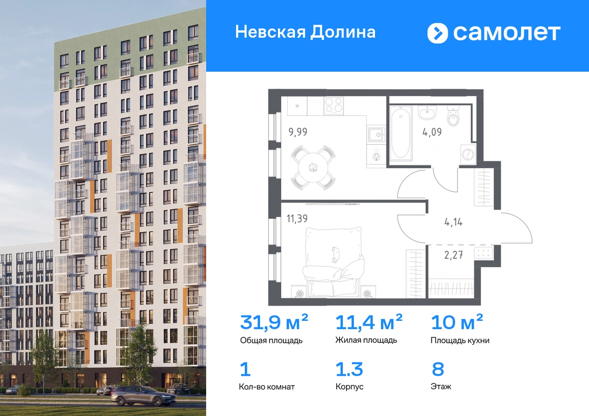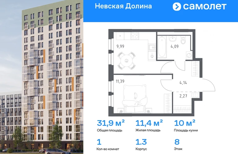 Предлагается 1-комнатная квартира комфорт-класса 31,88 кв.м в корпусе 1.3 на 8 этаже, в ЖК «Невская Долина» Квартира с чистовой отделкой. Доступность дополнительных опций уточняйте у застройщика. Приобрести квартиру возможно по специальным акциям от застройщика, с текущими условиями акций можно ознакомиться в блоке «Акций». Цена динамическая и может отличаться, уточняйте актуальность у застройщика. «Невская Долина» — зеленый холст для вашей жизни с уникальными палисадниками, садами и уютными уголками для отдыха. Всего в 5 минутах на машине — КАД, рядом — Большой Обуховский мост. До центра Петербурга — 35 минут на авто, до метро «Пролетарская» — 15 минут, до аэропорта Пулково — 30 минут. Комплекс находится на правом берегу Невы, рядом с Невским лесопарком, «МЕГА Парком» и парком развлечений. Скоро во дворе комплекса построят 4 детских сада и 2 школы. Рядом уже есть магазины «Дикси», «Магнит», пункты выдачи и аптеки. На первых этажах будут кафе и минимаркеты, откроется медицинский центр и физкультурно-оздоровительный комплекс. Архитектура домов сочетает в себе современность и функциональность — фасады украшены большими окнами, лоджиями, обычными и французскими балконами. В «Невской Долине» есть сады плодовых культур, игровые и спортивные зоны, 11 многоуровневых паркингов.#yan19-2r1803105#О застройщике