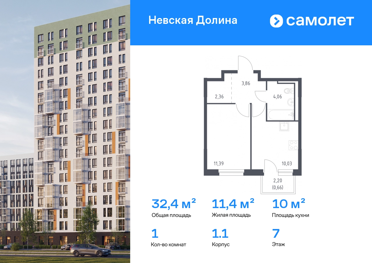 Предлагается 1-комнатная квартира комфорт-класса 32,36 кв.м в корпусе 1.1 на 7 этаже, в ЖК «Невская Долина» Квартира с чистовой отделкой. Доступность дополнительных опций уточняйте у застройщика. Приобрести квартиру возможно по специальным акциям от застройщика, с текущими условиями акций можно ознакомиться в блоке «Акций». Цена динамическая и может отличаться, уточняйте актуальность у застройщика. «Невская Долина» — зеленый холст для вашей жизни с уникальными палисадниками, садами и уютными уголками для отдыха. Всего в 5 минутах на машине — КАД, рядом — Большой Обуховский мост. До центра Петербурга — 35 минут на авто, до метро «Пролетарская» — 15 минут, до аэропорта Пулково — 30 минут. Комплекс находится на правом берегу Невы, рядом с Невским лесопарком, «МЕГА Парком» и парком развлечений. Скоро во дворе комплекса построят 4 детских сада и 2 школы. Рядом уже есть магазины «Дикси», «Магнит», пункты выдачи и аптеки. На первых этажах будут кафе и минимаркеты, откроется медицинский центр и физкультурно-оздоровительный комплекс. Архитектура домов сочетает в себе современность и функциональность — фасады украшены большими окнами, лоджиями, обычными и французскими балконами. В «Невской Долине» есть сады плодовых культур, игровые и спортивные зоны, 11 многоуровневых паркингов.#yan19-2r1803905#О застройщике