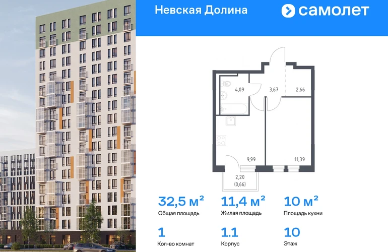 Предлагается 1-комнатная квартира комфорт-класса 32,46 кв.м в корпусе 1.1 на 10 этаже, в ЖК «Невская Долина» Квартира с чистовой отделкой. Доступность дополнительных опций уточняйте у застройщика. Приобрести квартиру возможно по специальным акциям от застройщика, с текущими условиями акций можно ознакомиться в блоке «Акций». Цена динамическая и может отличаться, уточняйте актуальность у застройщика. «Невская Долина» — зеленый холст для вашей жизни с уникальными палисадниками, садами и уютными уголками для отдыха. Всего в 5 минутах на машине — КАД, рядом — Большой Обуховский мост. До центра Петербурга — 35 минут на авто, до метро «Пролетарская» — 15 минут, до аэропорта Пулково — 30 минут. Комплекс находится на правом берегу Невы, рядом с Невским лесопарком, «МЕГА Парком» и парком развлечений. Скоро во дворе комплекса построят 4 детских сада и 2 школы. Рядом уже есть магазины «Дикси», «Магнит», пункты выдачи и аптеки. На первых этажах будут кафе и минимаркеты, откроется медицинский центр и физкультурно-оздоровительный комплекс. Архитектура домов сочетает в себе современность и функциональность — фасады украшены большими окнами, лоджиями, обычными и французскими балконами. В «Невской Долине» есть сады плодовых культур, игровые и спортивные зоны, 11 многоуровневых паркингов.#yan19-2r1804460#О застройщике