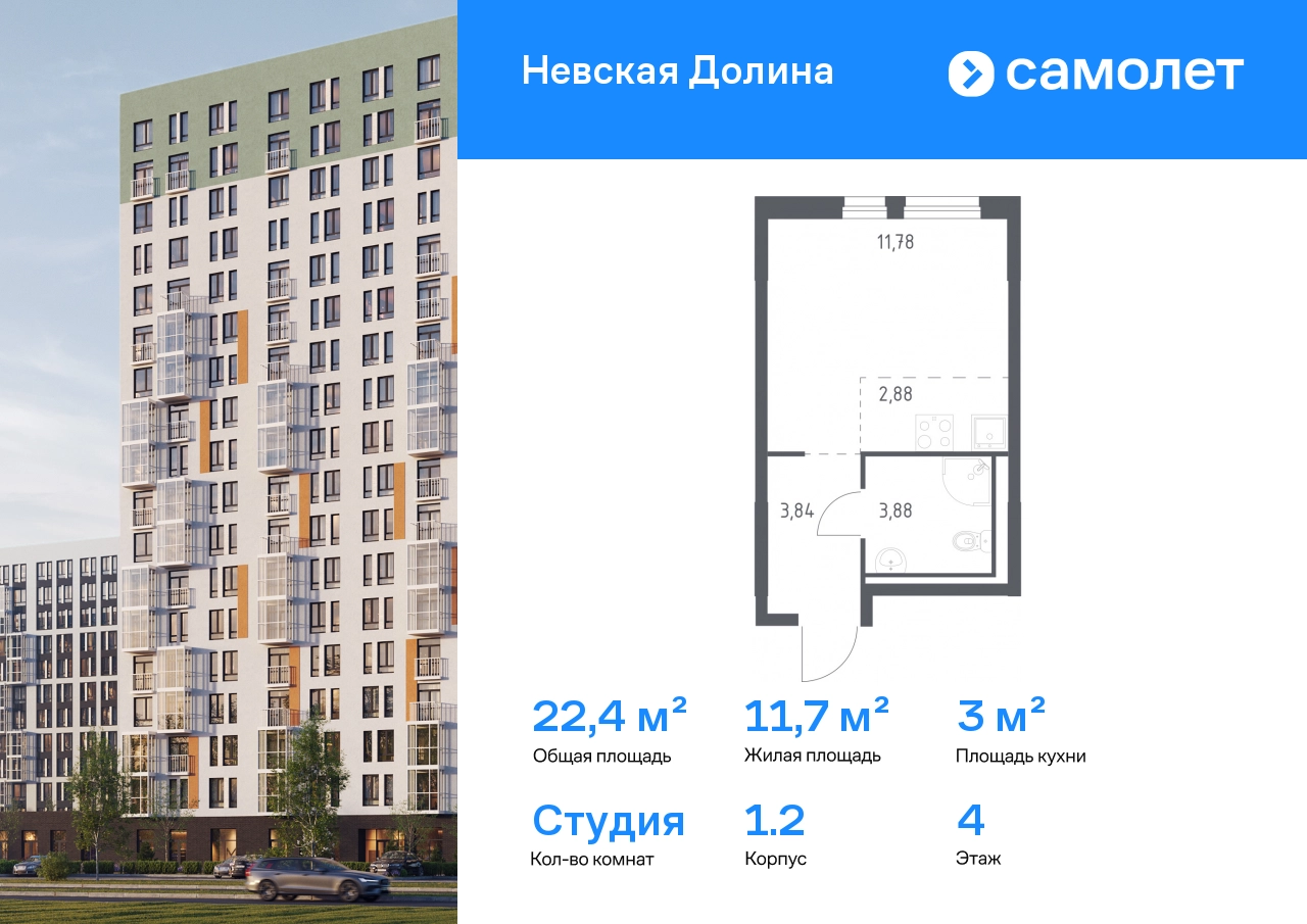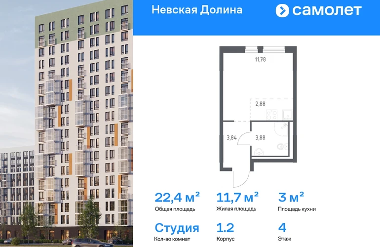 Предлагается квартира студия комфорт-класса 22,38 кв.м в корпусе 1.2 на 4 этаже, в ЖК «Невская Долина» Квартира с чистовой отделкой. Доступность дополнительных опций уточняйте у застройщика. Приобрести квартиру возможно по специальным акциям от застройщика, с текущими условиями акций можно ознакомиться в блоке «Акций». Цена динамическая и может отличаться, уточняйте актуальность у застройщика. «Невская Долина» — зеленый холст для вашей жизни с уникальными палисадниками, садами и уютными уголками для отдыха. Всего в 5 минутах на машине — КАД, рядом — Большой Обуховский мост. До центра Петербурга — 35 минут на авто, до метро «Пролетарская» — 15 минут, до аэропорта Пулково — 30 минут. Комплекс находится на правом берегу Невы, рядом с Невским лесопарком, «МЕГА Парком» и парком развлечений. Скоро во дворе комплекса построят 4 детских сада и 2 школы. Рядом уже есть магазины «Дикси», «Магнит», пункты выдачи и аптеки. На первых этажах будут кафе и минимаркеты, откроется медицинский центр и физкультурно-оздоровительный комплекс. Архитектура домов сочетает в себе современность и функциональность — фасады украшены большими окнами, лоджиями, обычными и французскими балконами. В «Невской Долине» есть сады плодовых культур, игровые и спортивные зоны, 11 многоуровневых паркингов.#yan19-2r1806424#О застройщике
