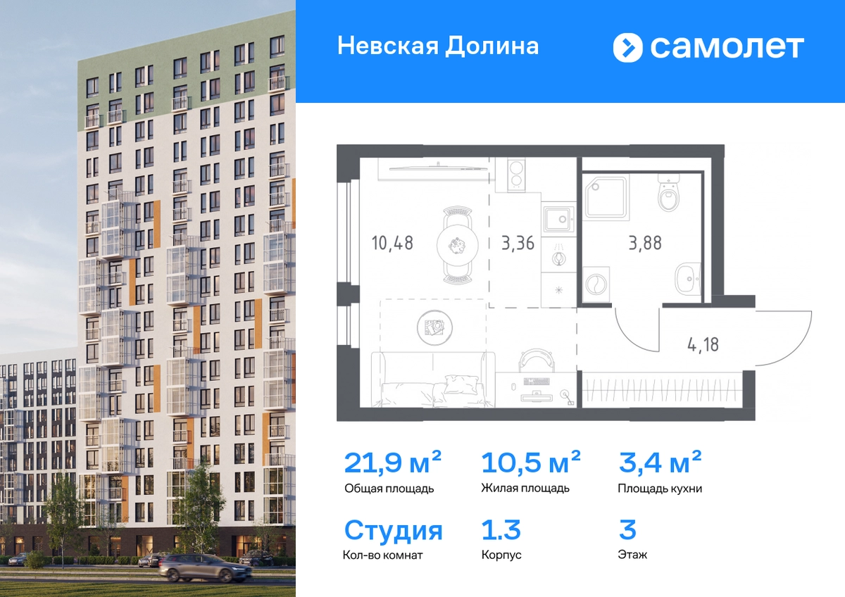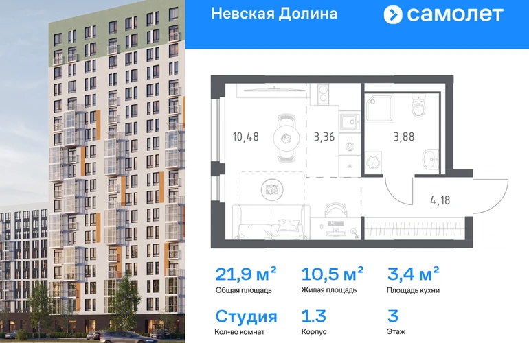 Предлагается квартира студия комфорт-класса 21,9 кв.м в корпусе 1.3 на 3 этаже, в ЖК «Невская Долина» Квартира с чистовой отделкой. Доступность дополнительных опций уточняйте у застройщика. Приобрести квартиру возможно по специальным акциям от застройщика, с текущими условиями акций можно ознакомиться в блоке «Акций». Цена динамическая и может отличаться, уточняйте актуальность у застройщика. «Невская Долина» — зеленый холст для вашей жизни с уникальными палисадниками, садами и уютными уголками для отдыха. Всего в 5 минутах на машине — КАД, рядом — Большой Обуховский мост. До центра Петербурга — 35 минут на авто, до метро «Пролетарская» — 15 минут, до аэропорта Пулково — 30 минут. Комплекс находится на правом берегу Невы, рядом с Невским лесопарком, «МЕГА Парком» и парком развлечений. Скоро во дворе комплекса построят 4 детских сада и 2 школы. Рядом уже есть магазины «Дикси», «Магнит», пункты выдачи и аптеки. На первых этажах будут кафе и минимаркеты, откроется медицинский центр и физкультурно-оздоровительный комплекс. Архитектура домов сочетает в себе современность и функциональность — фасады украшены большими окнами, лоджиями, обычными и французскими балконами. В «Невской Долине» есть сады плодовых культур, игровые и спортивные зоны, 11 многоуровневых паркингов.#yan19-2r1807397#О застройщике