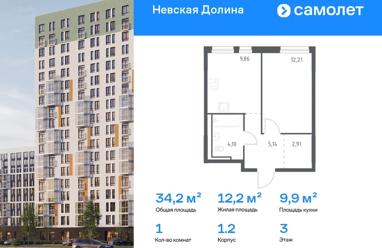 Предлагается 1-комнатная квартира комфорт-класса 34,22 кв.м в корпусе 1.2 на 3 этаже, в ЖК «Невская Долина» Квартира без отделки. Доступность опции «отделка» и возможность комплектации мебелью и декором уточняйте у застройщика. Приобрести квартиру возможно по специальным акциям от застройщика, с текущими условиями акций можно ознакомиться в блоке «Акций». Цена динамическая и может отличаться, уточняйте актуальность у застройщика. «Невская Долина» — зеленый холст для вашей жизни с уникальными палисадниками, садами и уютными уголками для отдыха. Всего в 5 минутах на машине — КАД, рядом — Большой Обуховский мост. До центра Петербурга — 35 минут на авто, до метро «Пролетарская» — 15 минут, до аэропорта Пулково — 30 минут. Комплекс находится на правом берегу Невы, рядом с Невским лесопарком, «МЕГА Парком» и парком развлечений. Скоро во дворе комплекса построят 4 детских сада и 2 школы. Рядом уже есть магазины «Дикси», «Магнит», пункты выдачи и аптеки. На первых этажах будут кафе и минимаркеты, откроется медицинский центр и физкультурно-оздоровительный комплекс. Архитектура домов сочетает в себе современность и функциональность — фасады украшены большими окнами, лоджиями, обычными и французскими балконами. В «Невской Долине» есть сады плодовых культур, игровые и спортивные зоны, 11 многоуровневых паркингов.#yan19-2r1807782#О застройщике