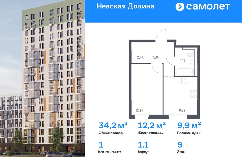 Предлагается 1-комнатная квартира комфорт-класса 34,22 кв.м в корпусе 1.1 на 9 этаже, в ЖК «Невская Долина» Квартира с чистовой отделкой. Доступность дополнительных опций уточняйте у застройщика. Приобрести квартиру возможно по специальным акциям от застройщика, с текущими условиями акций можно ознакомиться в блоке «Акций». Цена динамическая и может отличаться, уточняйте актуальность у застройщика. «Невская Долина» — зеленый холст для вашей жизни с уникальными палисадниками, садами и уютными уголками для отдыха. Всего в 5 минутах на машине — КАД, рядом — Большой Обуховский мост. До центра Петербурга — 35 минут на авто, до метро «Пролетарская» — 15 минут, до аэропорта Пулково — 30 минут. Комплекс находится на правом берегу Невы, рядом с Невским лесопарком, «МЕГА Парком» и парком развлечений. Скоро во дворе комплекса построят 4 детских сада и 2 школы. Рядом уже есть магазины «Дикси», «Магнит», пункты выдачи и аптеки. На первых этажах будут кафе и минимаркеты, откроется медицинский центр и физкультурно-оздоровительный комплекс. Архитектура домов сочетает в себе современность и функциональность — фасады украшены большими окнами, лоджиями, обычными и французскими балконами. В «Невской Долине» есть сады плодовых культур, игровые и спортивные зоны, 11 многоуровневых паркингов.#yan19-2r1807790#О застройщике