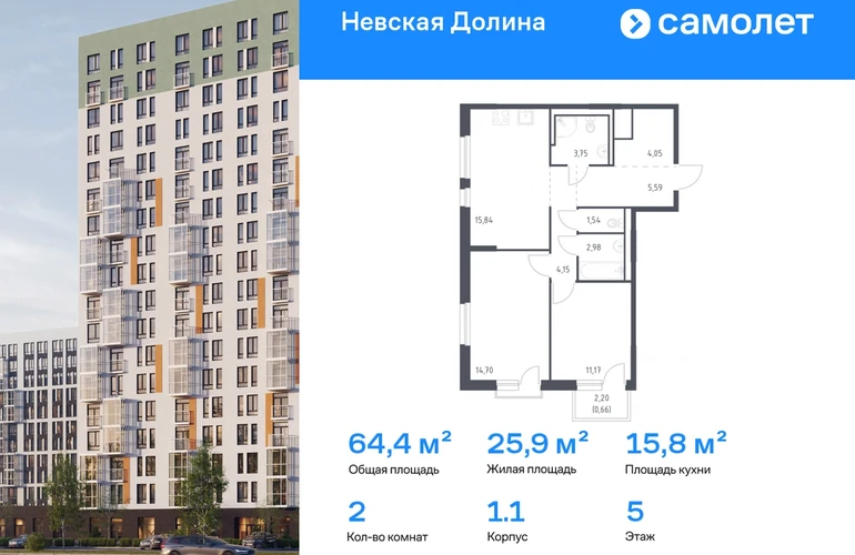 Предлагается 2-комнатная квартира комфорт-класса 64,43 кв.м в корпусе 1.1 на 5 этаже, в ЖК «Невская Долина» Квартира с чистовой отделкой. Доступность дополнительных опций уточняйте у застройщика. Приобрести квартиру возможно по специальным акциям от застройщика, с текущими условиями акций можно ознакомиться в блоке «Акций». Цена динамическая и может отличаться, уточняйте актуальность у застройщика. «Невская Долина» — зеленый холст для вашей жизни с уникальными палисадниками, садами и уютными уголками для отдыха. Всего в 5 минутах на машине — КАД, рядом — Большой Обуховский мост. До центра Петербурга — 35 минут на авто, до метро «Пролетарская» — 15 минут, до аэропорта Пулково — 30 минут. Комплекс находится на правом берегу Невы, рядом с Невским лесопарком, «МЕГА Парком» и парком развлечений. Скоро во дворе комплекса построят 4 детских сада и 2 школы. Рядом уже есть магазины «Дикси», «Магнит», пункты выдачи и аптеки. На первых этажах будут кафе и минимаркеты, откроется медицинский центр и физкультурно-оздоровительный комплекс. Архитектура домов сочетает в себе современность и функциональность — фасады украшены большими окнами, лоджиями, обычными и французскими балконами. В «Невской Долине» есть сады плодовых культур, игровые и спортивные зоны, 11 многоуровневых паркингов.#yan19-2r1807791#О застройщике