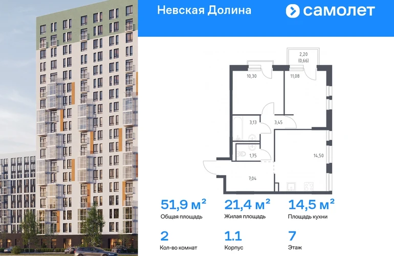 Предлагается 2-комнатная квартира комфорт-класса 51,91 кв.м в корпусе 1.1 на 7 этаже, в ЖК «Невская Долина» Квартира с чистовой отделкой. Доступность дополнительных опций уточняйте у застройщика. Приобрести квартиру возможно по специальным акциям от застройщика, с текущими условиями акций можно ознакомиться в блоке «Акций». Цена динамическая и может отличаться, уточняйте актуальность у застройщика. «Невская Долина» — зеленый холст для вашей жизни с уникальными палисадниками, садами и уютными уголками для отдыха. Всего в 5 минутах на машине — КАД, рядом — Большой Обуховский мост. До центра Петербурга — 35 минут на авто, до метро «Пролетарская» — 15 минут, до аэропорта Пулково — 30 минут. Комплекс находится на правом берегу Невы, рядом с Невским лесопарком, «МЕГА Парком» и парком развлечений. Скоро во дворе комплекса построят 4 детских сада и 2 школы. Рядом уже есть магазины «Дикси», «Магнит», пункты выдачи и аптеки. На первых этажах будут кафе и минимаркеты, откроется медицинский центр и физкультурно-оздоровительный комплекс. Архитектура домов сочетает в себе современность и функциональность — фасады украшены большими окнами, лоджиями, обычными и французскими балконами. В «Невской Долине» есть сады плодовых культур, игровые и спортивные зоны, 11 многоуровневых паркингов.#yan19-2r1807793#О застройщике
