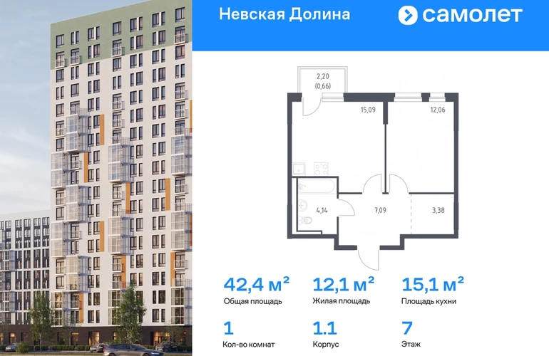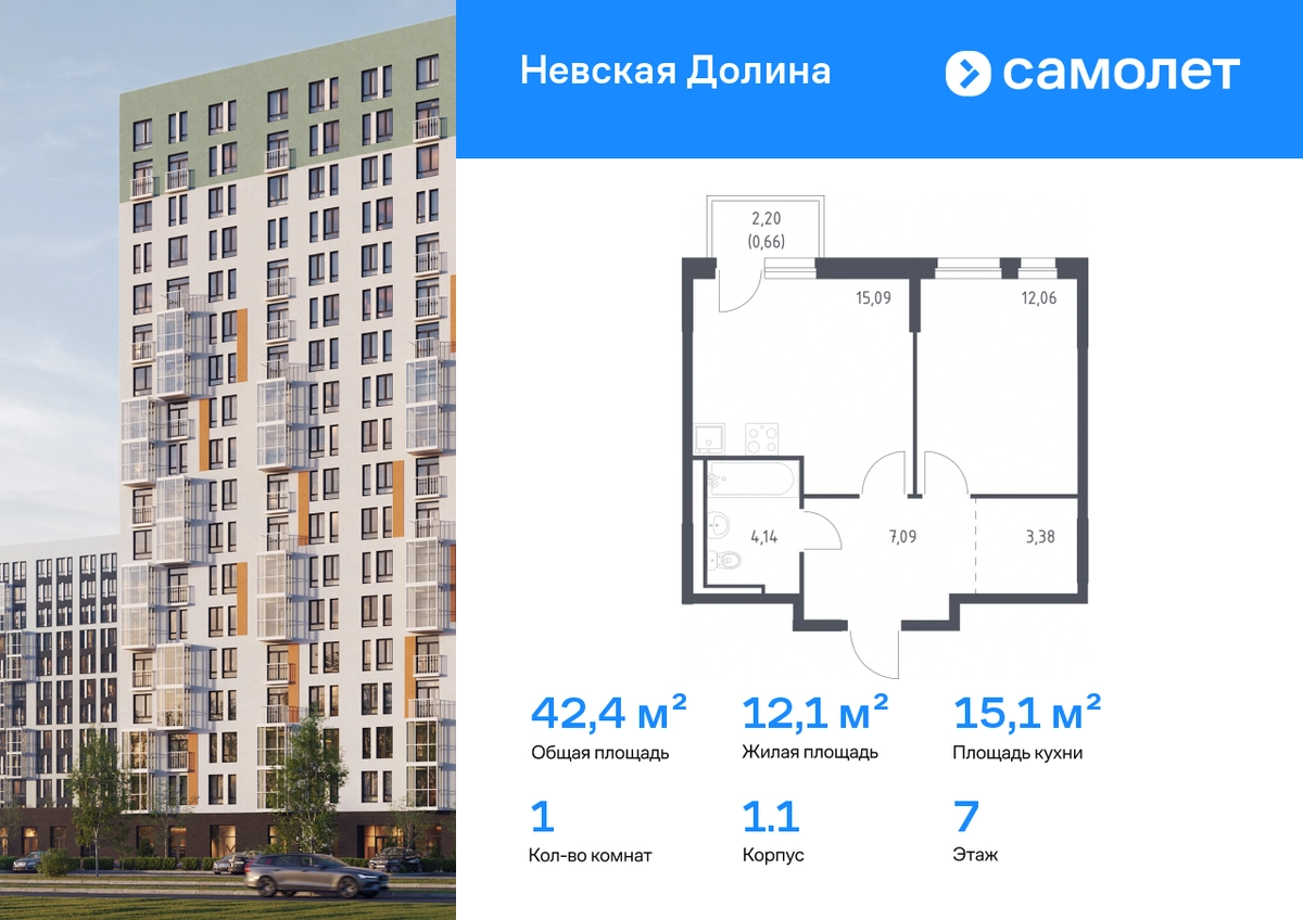 Предлагается 1-комнатная квартира комфорт-класса 42,42 кв.м в корпусе 1.1 на 7 этаже, в ЖК «Невская Долина» Квартира с чистовой отделкой. Доступность дополнительных опций уточняйте у застройщика. Приобрести квартиру возможно по специальным акциям от застройщика, с текущими условиями акций можно ознакомиться в блоке «Акций». Цена динамическая и может отличаться, уточняйте актуальность у застройщика. «Невская Долина» — зеленый холст для вашей жизни с уникальными палисадниками, садами и уютными уголками для отдыха. Всего в 5 минутах на машине — КАД, рядом — Большой Обуховский мост. До центра Петербурга — 35 минут на авто, до метро «Пролетарская» — 15 минут, до аэропорта Пулково — 30 минут. Комплекс находится на правом берегу Невы, рядом с Невским лесопарком, «МЕГА Парком» и парком развлечений. Скоро во дворе комплекса построят 4 детских сада и 2 школы. Рядом уже есть магазины «Дикси», «Магнит», пункты выдачи и аптеки. На первых этажах будут кафе и минимаркеты, откроется медицинский центр и физкультурно-оздоровительный комплекс. Архитектура домов сочетает в себе современность и функциональность — фасады украшены большими окнами, лоджиями, обычными и французскими балконами. В «Невской Долине» есть сады плодовых культур, игровые и спортивные зоны, 11 многоуровневых паркингов.#yan19-2r1807795#О застройщике