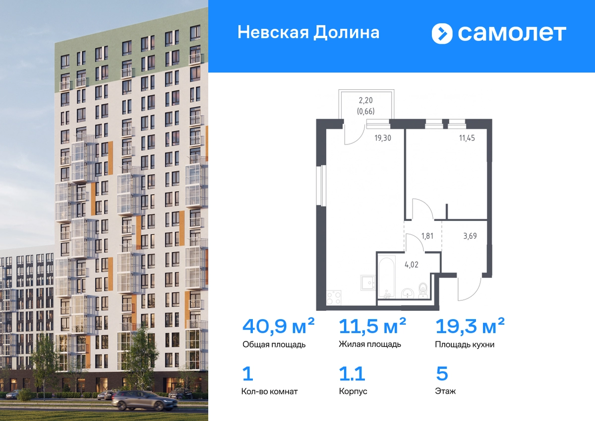 Предлагается 1-комнатная квартира комфорт-класса 40,93 кв.м в корпусе 1.1 на 5 этаже, в ЖК «Невская Долина» Квартира с чистовой отделкой. Доступность дополнительных опций уточняйте у застройщика. Приобрести квартиру возможно по специальным акциям от застройщика, с текущими условиями акций можно ознакомиться в блоке «Акций». Цена динамическая и может отличаться, уточняйте актуальность у застройщика. «Невская Долина» — зеленый холст для вашей жизни с уникальными палисадниками, садами и уютными уголками для отдыха. Всего в 5 минутах на машине — КАД, рядом — Большой Обуховский мост. До центра Петербурга — 35 минут на авто, до метро «Пролетарская» — 15 минут, до аэропорта Пулково — 30 минут. Комплекс находится на правом берегу Невы, рядом с Невским лесопарком, «МЕГА Парком» и парком развлечений. Скоро во дворе комплекса построят 4 детских сада и 2 школы. Рядом уже есть магазины «Дикси», «Магнит», пункты выдачи и аптеки. На первых этажах будут кафе и минимаркеты, откроется медицинский центр и физкультурно-оздоровительный комплекс. Архитектура домов сочетает в себе современность и функциональность — фасады украшены большими окнами, лоджиями, обычными и французскими балконами. В «Невской Долине» есть сады плодовых культур, игровые и спортивные зоны, 11 многоуровневых паркингов.#yan19-2r1807797#О застройщике