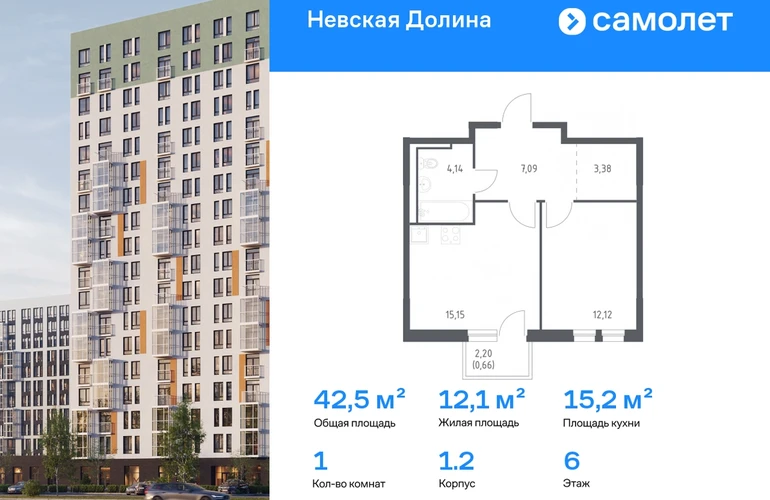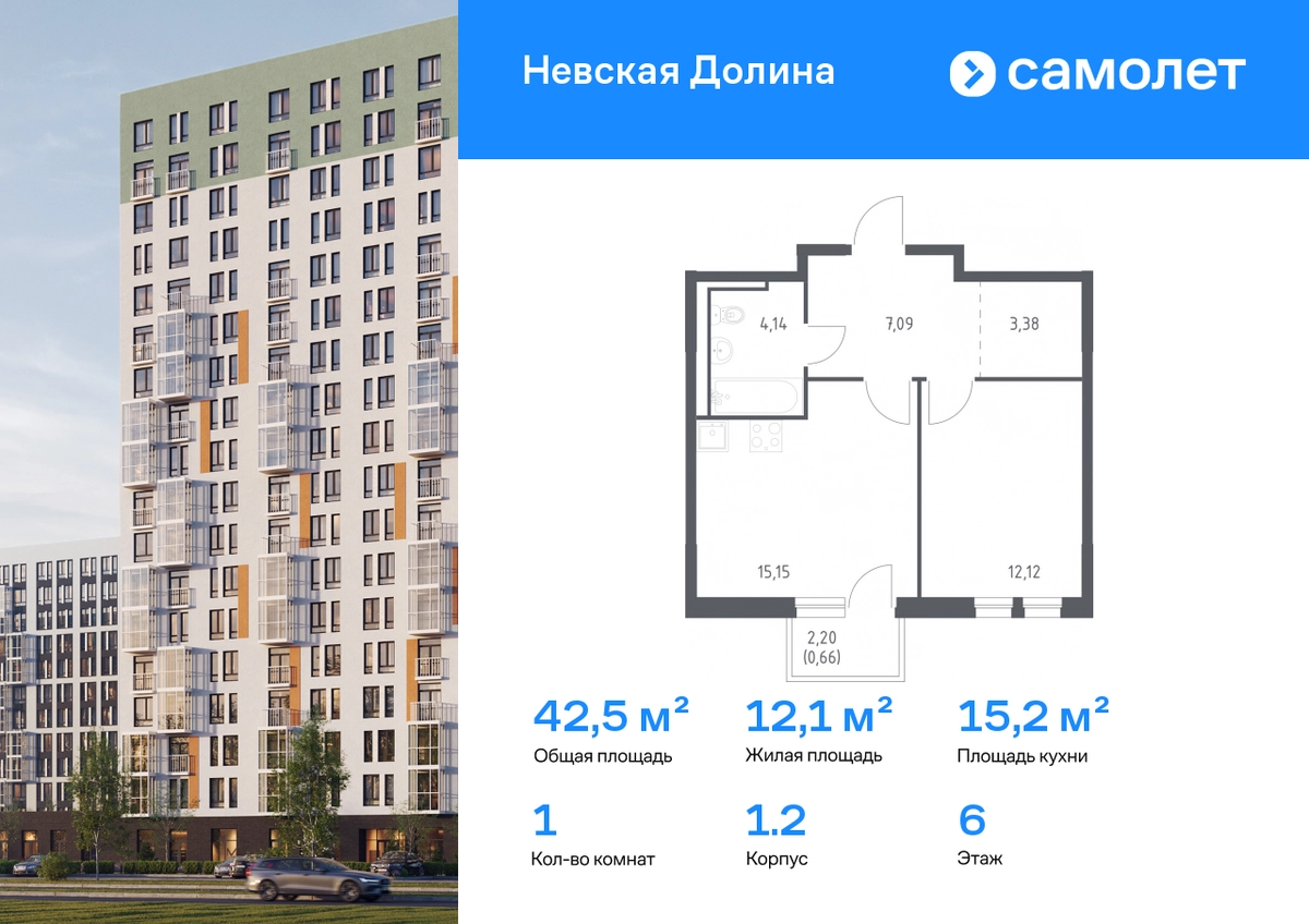 Предлагается 1-комнатная квартира комфорт-класса 42,54 кв.м в корпусе 1.2 на 6 этаже, в ЖК «Невская Долина» Квартира без отделки. Доступность опции «отделка» и возможность комплектации мебелью и декором уточняйте у застройщика. Приобрести квартиру возможно по специальным акциям от застройщика, с текущими условиями акций можно ознакомиться в блоке «Акций». Цена динамическая и может отличаться, уточняйте актуальность у застройщика. «Невская Долина» — зеленый холст для вашей жизни с уникальными палисадниками, садами и уютными уголками для отдыха. Всего в 5 минутах на машине — КАД, рядом — Большой Обуховский мост. До центра Петербурга — 35 минут на авто, до метро «Пролетарская» — 15 минут, до аэропорта Пулково — 30 минут. Комплекс находится на правом берегу Невы, рядом с Невским лесопарком, «МЕГА Парком» и парком развлечений. Скоро во дворе комплекса построят 4 детских сада и 2 школы. Рядом уже есть магазины «Дикси», «Магнит», пункты выдачи и аптеки. На первых этажах будут кафе и минимаркеты, откроется медицинский центр и физкультурно-оздоровительный комплекс. Архитектура домов сочетает в себе современность и функциональность — фасады украшены большими окнами, лоджиями, обычными и французскими балконами. В «Невской Долине» есть сады плодовых культур, игровые и спортивные зоны, 11 многоуровневых паркингов.#yan19-2r1808920#О застройщике