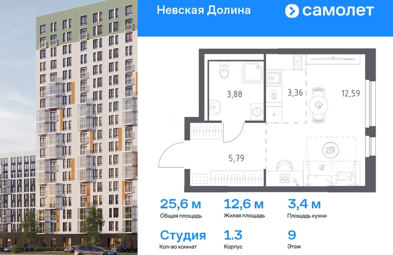 Предлагается квартира студия комфорт-класса 25,62 кв.м в корпусе 1.3 на 9 этаже, в ЖК «Невская Долина» Квартира с чистовой отделкой. Доступность дополнительных опций уточняйте у застройщика. Приобрести квартиру возможно по специальным акциям от застройщика, с текущими условиями акций можно ознакомиться в блоке «Акций». Цена динамическая и может отличаться, уточняйте актуальность у застройщика. «Невская Долина» — зеленый холст для вашей жизни с уникальными палисадниками, садами и уютными уголками для отдыха. Всего в 5 минутах на машине — КАД, рядом — Большой Обуховский мост. До центра Петербурга — 35 минут на авто, до метро «Пролетарская» — 15 минут, до аэропорта Пулково — 30 минут. Комплекс находится на правом берегу Невы, рядом с Невским лесопарком, «МЕГА Парком» и парком развлечений. Скоро во дворе комплекса построят 4 детских сада и 2 школы. Рядом уже есть магазины «Дикси», «Магнит», пункты выдачи и аптеки. На первых этажах будут кафе и минимаркеты, откроется медицинский центр и физкультурно-оздоровительный комплекс. Архитектура домов сочетает в себе современность и функциональность — фасады украшены большими окнами, лоджиями, обычными и французскими балконами. В «Невской Долине» есть сады плодовых культур, игровые и спортивные зоны, 11 многоуровневых паркингов.#yan19-2r1810353#О застройщике