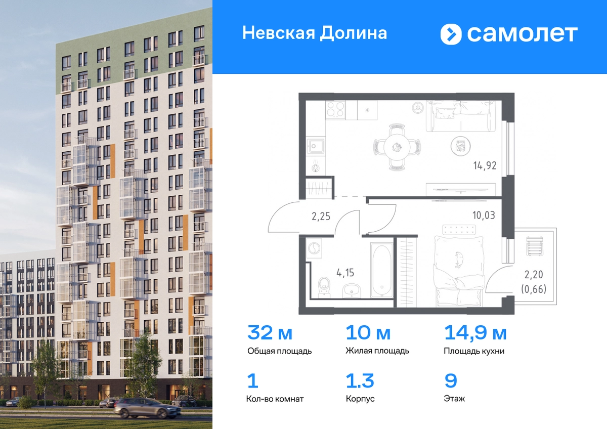 Предлагается 1-комнатная квартира комфорт-класса 32,01 кв.м в корпусе 1.3 на 9 этаже, в ЖК «Невская Долина» Квартира с чистовой отделкой. Доступность дополнительных опций уточняйте у застройщика. Приобрести квартиру возможно по специальным акциям от застройщика, с текущими условиями акций можно ознакомиться в блоке «Акций». Цена динамическая и может отличаться, уточняйте актуальность у застройщика. «Невская Долина» — зеленый холст для вашей жизни с уникальными палисадниками, садами и уютными уголками для отдыха. Всего в 5 минутах на машине — КАД, рядом — Большой Обуховский мост. До центра Петербурга — 35 минут на авто, до метро «Пролетарская» — 15 минут, до аэропорта Пулково — 30 минут. Комплекс находится на правом берегу Невы, рядом с Невским лесопарком, «МЕГА Парком» и парком развлечений. Скоро во дворе комплекса построят 4 детских сада и 2 школы. Рядом уже есть магазины «Дикси», «Магнит», пункты выдачи и аптеки. На первых этажах будут кафе и минимаркеты, откроется медицинский центр и физкультурно-оздоровительный комплекс. Архитектура домов сочетает в себе современность и функциональность — фасады украшены большими окнами, лоджиями, обычными и французскими балконами. В «Невской Долине» есть сады плодовых культур, игровые и спортивные зоны, 11 многоуровневых паркингов.#yan19-2r1810354#О застройщике