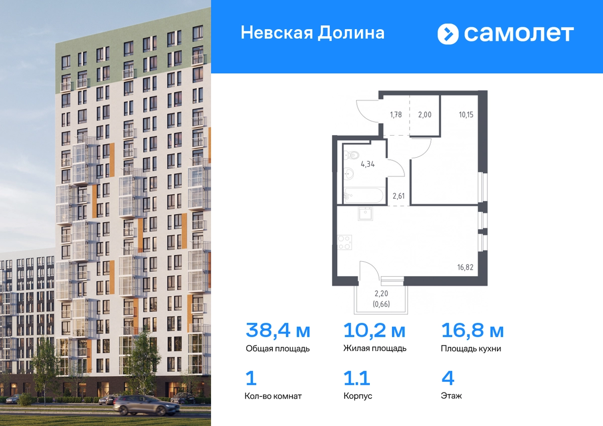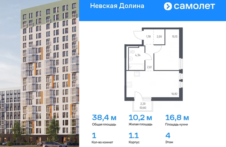 Предлагается 1-комнатная квартира комфорт-класса 38,36 кв.м в корпусе 1.1 на 4 этаже, в ЖК «Невская Долина» Квартира с предчистовой отделкой. Доступность дополнительных опций уточняйте у застройщика. Приобрести квартиру возможно по специальным акциям от застройщика, с текущими условиями акций можно ознакомиться в блоке «Акций». Цена динамическая и может отличаться, уточняйте актуальность у застройщика. «Невская Долина» — зеленый холст для вашей жизни с уникальными палисадниками, садами и уютными уголками для отдыха. Всего в 5 минутах на машине — КАД, рядом — Большой Обуховский мост. До центра Петербурга — 35 минут на авто, до метро «Пролетарская» — 15 минут, до аэропорта Пулково — 30 минут. Комплекс находится на правом берегу Невы, рядом с Невским лесопарком, «МЕГА Парком» и парком развлечений. Скоро во дворе комплекса построят 4 детских сада и 2 школы. Рядом уже есть магазины «Дикси», «Магнит», пункты выдачи и аптеки. На первых этажах будут кафе и минимаркеты, откроется медицинский центр и физкультурно-оздоровительный комплекс. Архитектура домов сочетает в себе современность и функциональность — фасады украшены большими окнами, лоджиями, обычными и французскими балконами. В «Невской Долине» есть сады плодовых культур, игровые и спортивные зоны, 11 многоуровневых паркингов.#yan19-2r1810355#О застройщике