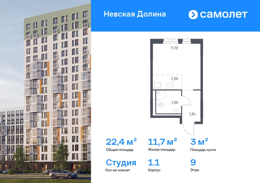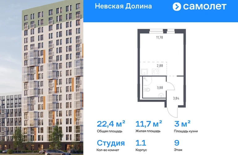 Предлагается квартира студия комфорт-класса 22,38 кв.м в корпусе 1.1 на 9 этаже, в ЖК «Невская Долина» Квартира с чистовой отделкой. Доступность дополнительных опций уточняйте у застройщика. Приобрести квартиру возможно по специальным акциям от застройщика, с текущими условиями акций можно ознакомиться в блоке «Акций». Цена динамическая и может отличаться, уточняйте актуальность у застройщика. «Невская Долина» — зеленый холст для вашей жизни с уникальными палисадниками, садами и уютными уголками для отдыха. Всего в 5 минутах на машине — КАД, рядом — Большой Обуховский мост. До центра Петербурга — 35 минут на авто, до метро «Пролетарская» — 15 минут, до аэропорта Пулково — 30 минут. Комплекс находится на правом берегу Невы, рядом с Невским лесопарком, «МЕГА Парком» и парком развлечений. Скоро во дворе комплекса построят 4 детских сада и 2 школы. Рядом уже есть магазины «Дикси», «Магнит», пункты выдачи и аптеки. На первых этажах будут кафе и минимаркеты, откроется медицинский центр и физкультурно-оздоровительный комплекс. Архитектура домов сочетает в себе современность и функциональность — фасады украшены большими окнами, лоджиями, обычными и французскими балконами. В «Невской Долине» есть сады плодовых культур, игровые и спортивные зоны, 11 многоуровневых паркингов.#yan19-2r1811105#О застройщике