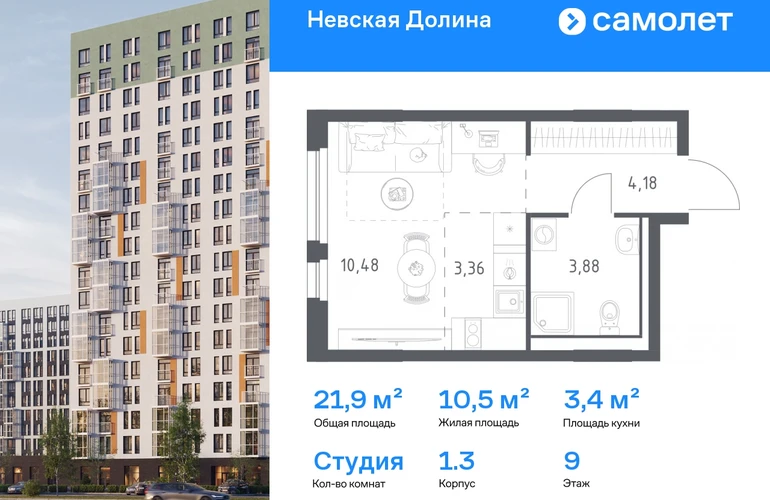 Предлагается квартира студия комфорт-класса 21,9 кв.м в корпусе 1.3 на 9 этаже, в ЖК «Невская Долина» Квартира с чистовой отделкой. Доступность дополнительных опций уточняйте у застройщика. Приобрести квартиру возможно по специальным акциям от застройщика, с текущими условиями акций можно ознакомиться в блоке «Акций». Цена динамическая и может отличаться, уточняйте актуальность у застройщика. «Невская Долина» — зеленый холст для вашей жизни с уникальными палисадниками, садами и уютными уголками для отдыха. Всего в 5 минутах на машине — КАД, рядом — Большой Обуховский мост. До центра Петербурга — 35 минут на авто, до метро «Пролетарская» — 15 минут, до аэропорта Пулково — 30 минут. Комплекс находится на правом берегу Невы, рядом с Невским лесопарком, «МЕГА Парком» и парком развлечений. Скоро во дворе комплекса построят 4 детских сада и 2 школы. Рядом уже есть магазины «Дикси», «Магнит», пункты выдачи и аптеки. На первых этажах будут кафе и минимаркеты, откроется медицинский центр и физкультурно-оздоровительный комплекс. Архитектура домов сочетает в себе современность и функциональность — фасады украшены большими окнами, лоджиями, обычными и французскими балконами. В «Невской Долине» есть сады плодовых культур, игровые и спортивные зоны, 11 многоуровневых паркингов.#yan19-2r1813101#О застройщике
