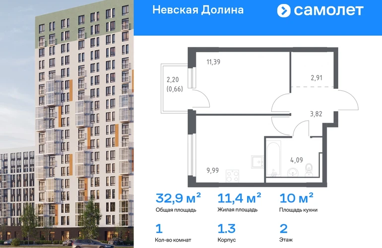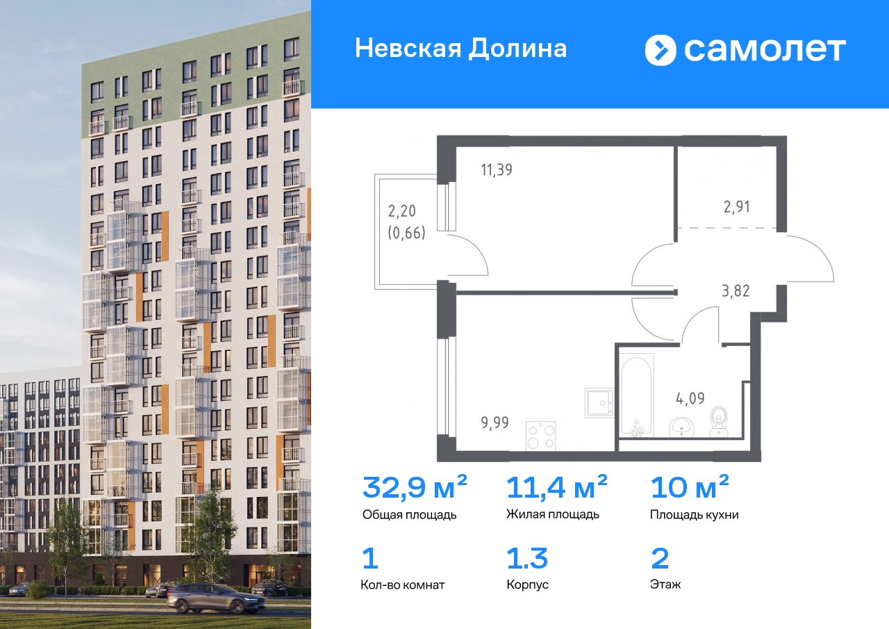 Предлагается 1-комнатная квартира комфорт-класса 32,86 кв.м в корпусе 1.3 на 2 этаже, в ЖК «Невская Долина» Квартира с предчистовой отделкой. Доступность дополнительных опций уточняйте у застройщика. Приобрести квартиру возможно по специальным акциям от застройщика, с текущими условиями акций можно ознакомиться в блоке «Акций». Цена динамическая и может отличаться, уточняйте актуальность у застройщика. «Невская Долина» — зеленый холст для вашей жизни с уникальными палисадниками, садами и уютными уголками для отдыха. Всего в 5 минутах на машине — КАД, рядом — Большой Обуховский мост. До центра Петербурга — 35 минут на авто, до метро «Пролетарская» — 15 минут, до аэропорта Пулково — 30 минут. Комплекс находится на правом берегу Невы, рядом с Невским лесопарком, «МЕГА Парком» и парком развлечений. Скоро во дворе комплекса построят 4 детских сада и 2 школы. Рядом уже есть магазины «Дикси», «Магнит», пункты выдачи и аптеки. На первых этажах будут кафе и минимаркеты, откроется медицинский центр и физкультурно-оздоровительный комплекс. Архитектура домов сочетает в себе современность и функциональность — фасады украшены большими окнами, лоджиями, обычными и французскими балконами. В «Невской Долине» есть сады плодовых культур, игровые и спортивные зоны, 11 многоуровневых паркингов.#yan19-2r1813102#О застройщике