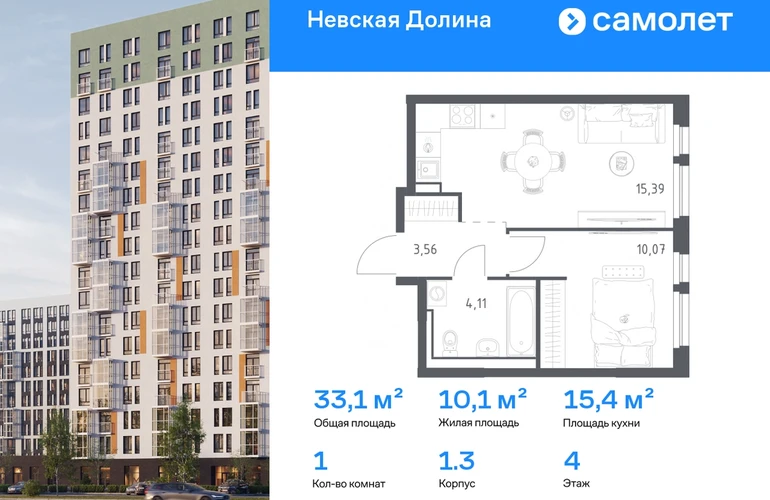 Предлагается 1-комнатная квартира комфорт-класса 33,13 кв.м в корпусе 1.3 на 4 этаже, в ЖК «Невская Долина» Квартира без отделки. Доступность опции «отделка» и возможность комплектации мебелью и декором уточняйте у застройщика. Приобрести квартиру возможно по специальным акциям от застройщика, с текущими условиями акций можно ознакомиться в блоке «Акций». Цена динамическая и может отличаться, уточняйте актуальность у застройщика. «Невская Долина» — зеленый холст для вашей жизни с уникальными палисадниками, садами и уютными уголками для отдыха. Всего в 5 минутах на машине — КАД, рядом — Большой Обуховский мост. До центра Петербурга — 35 минут на авто, до метро «Пролетарская» — 15 минут, до аэропорта Пулково — 30 минут. Комплекс находится на правом берегу Невы, рядом с Невским лесопарком, «МЕГА Парком» и парком развлечений. Скоро во дворе комплекса построят 4 детских сада и 2 школы. Рядом уже есть магазины «Дикси», «Магнит», пункты выдачи и аптеки. На первых этажах будут кафе и минимаркеты, откроется медицинский центр и физкультурно-оздоровительный комплекс. Архитектура домов сочетает в себе современность и функциональность — фасады украшены большими окнами, лоджиями, обычными и французскими балконами. В «Невской Долине» есть сады плодовых культур, игровые и спортивные зоны, 11 многоуровневых паркингов.#yan19-2r1814019#О застройщике