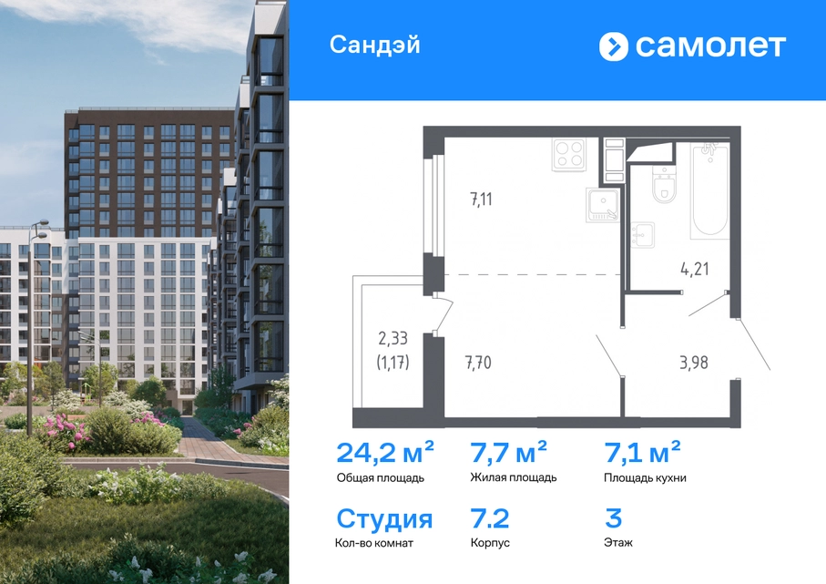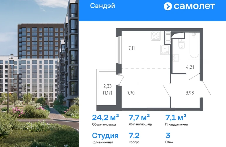 Предлагается квартира студия комфорт-класса 24,17 кв.м в корпусе 7.2 на 3 этаже, в ЖК «Сандэй» Квартира с чистовой отделкой. Доступность дополнительных опций уточняйте у застройщика. Приобрести квартиру возможно по специальным акциям от застройщика, с текущими условиями акций можно ознакомиться в блоке «Акций». Цена динамическая и может отличаться, уточняйте актуальность у застройщика. Сандэй – современный жилой комплекс на юго-западе Санкт-Петербурга у парка Сосновая поляна. Мы уже построили 7 средне-этажных домов, вся социальная и бытовая инфраструктура уже работает, рядом есть детские сады, школы, поликлиники и магазины – проживание будет очень комфортным. Прямо под окнами большой зеленый парк для прогулок - Сосновая Поляна В 7 минутах пешком расположена железнодорожная станция, от которой можно за 25 минут добраться до центральной части города – Балтийского вокзала. В 15 минутах езды самые известные пригороды Петербурга: Стрельна, Петергоф, а также берег Финского залива.#yan19-2r1807780#О застройщике