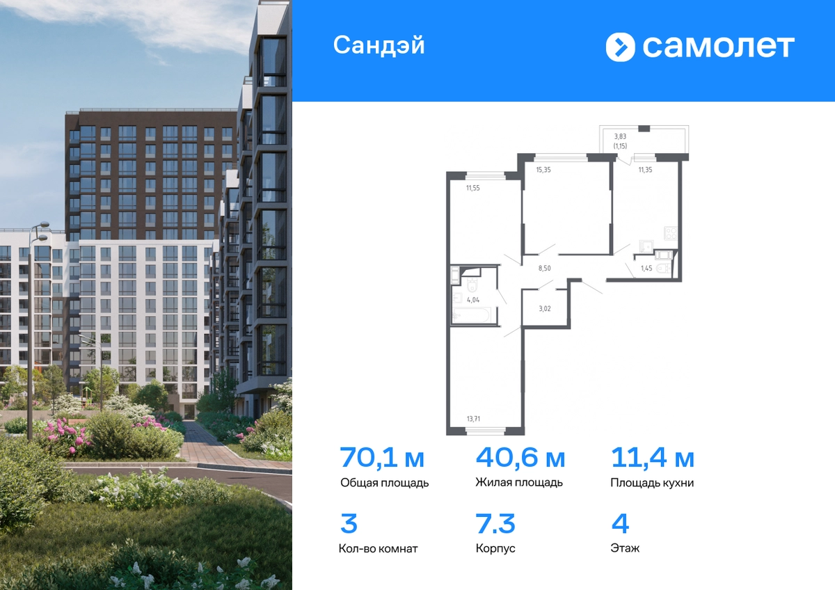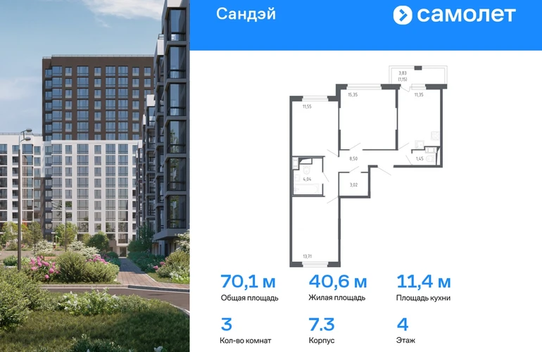 Предлагается 3-комнатная квартира комфорт-класса 70,12 кв.м в корпусе 7.3 на 4 этаже, в ЖК «Сандэй» Квартира с чистовой отделкой. Доступность дополнительных опций уточняйте у застройщика. Приобрести квартиру возможно по специальным акциям от застройщика, с текущими условиями акций можно ознакомиться в блоке «Акций». Цена динамическая и может отличаться, уточняйте актуальность у застройщика. Сандэй – современный жилой комплекс на юго-западе Санкт-Петербурга у парка Сосновая поляна. Мы уже построили 7 средне-этажных домов, вся социальная и бытовая инфраструктура уже работает, рядом есть детские сады, школы, поликлиники и магазины – проживание будет очень комфортным. Прямо под окнами большой зеленый парк для прогулок - Сосновая Поляна В 7 минутах пешком расположена железнодорожная станция, от которой можно за 25 минут добраться до центральной части города – Балтийского вокзала. В 15 минутах езды самые известные пригороды Петербурга: Стрельна, Петергоф, а также берег Финского залива.#yan19-2r1810699#О застройщике