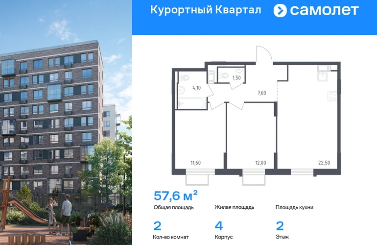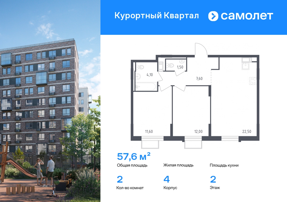 Предлагается 2-комнатная квартира комфорт-класса 57,6 кв.м в корпусе 4 на 2 этаже, в ЖК «Курортный Квартал» Квартира с чистовой отделкой. Доступность дополнительных опций уточняйте у застройщика. Приобрести квартиру возможно по специальным акциям от застройщика, с текущими условиями акций можно ознакомиться в блоке «Акций». Цена динамическая и может отличаться, уточняйте актуальность у застройщика. Чтобы воплотить ваши мечты о жизни на курорте, мы построили проект комфорт-класса в 20 минутах от Финского залива. «Курортный Квартал» расположен в престижном районе поселка Песочный, всего в 25 минутах от центра Петербурга и 20 минутах до метро. На территории будет школа на 1100 мест с бассейном и детский сад на 110 мест. На первых этажах откроются кафе, магазины и пекарни. Рядом — спортивные секции и медицинские центры. В 3 минутах от дома — Курортный лесопарк для пикников и спорта на свежем воздухе. В выходные можно загорать на пляжах Финского залива или наблюдать за цаплями на Сестрорецком разливе. Корпуса высотой 7–10 этажей с фасадами в природных оттенках. Приватные дворы-парки без машин — с тренажерами и детскими площадками. Есть зеленый бульвар и сквер для отдыха. Предусмотрен открытый паркинг. В сквозных парадных — безбарьерная среда и помещения для хранения колясок. Все квартиры — с готовой отделкой, поэтому вам не придется тратить время и силы на ремонт. #yan19-2r1802576#О застройщике