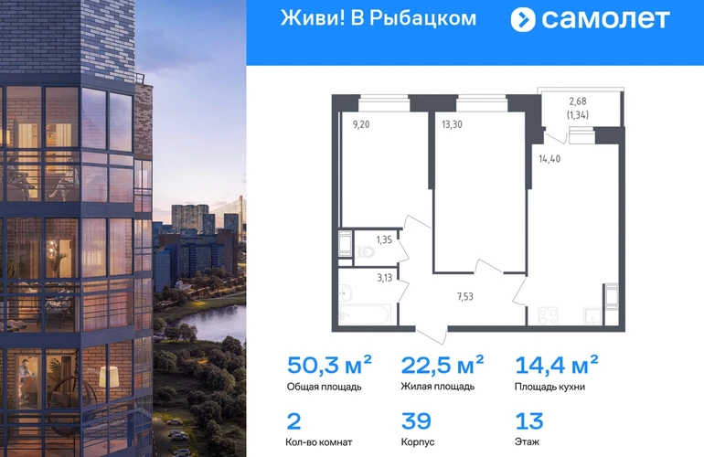 Предлагается 2-комнатная квартира комфорт-класса 50,25 кв.м в корпусе 39 на 13 этаже, в ЖК «Живи! В Рыбацком» Квартира с чистовой отделкой. Доступность дополнительных опций уточняйте у застройщика. Приобрести квартиру возможно по специальным акциям от застройщика, с текущими условиями акций можно ознакомиться в блоке «Акций». Цена динамическая и может отличаться, уточняйте актуальность у застройщика. Квартал «Живи! В Рыбацком» в Невском районе Санкт-Петербурга расположен рядом с рекой Славянкой и парком. Всего 20 минут пешей прогулки — и вы у метро «Рыбацкое». Автомобилисты будут добираться до КАДа за десять минут. В квартале работают два детских сада, школа и кабинет врача. На первых этажах зданий открыты магазины, кафе и салоны красоты. Во дворе — зеленые бульвары, воркаут-площадка, спортивный и игровой кластеры. Для машин — подземный паркинг. Кирпично-монолитные дома с каменной облицовкой — воплощение долговечности и тепла. Есть в квартале и камерный 30-й корпус, в нем восемь этажей, 70 квартир и приватный двор-парк. В сквозных парадных — безбарьерная среда, помещения для хранения колясок и велосипедов и система видеонаблюдения. #yan19-2r1804130#О застройщике